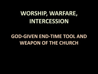 This document discusses the role of worship, warfare, and intercession as God-given tools for the end-times church. It argues that these practices: 1) Prepare the way for the Lord by establishing His kingdom on earth through establishing Zion, where He dwells and rules; 2) Are weapons that use the Word of God to overthrow the forces of evil; and 3) Will raise up a prophetic army of worshiping intercessors to declare God's praises and make straight the way for His coming through purified lives and lifted up gates.
