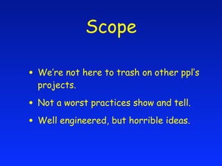 The document describes two presentations by Aaron and Ryan Davis on identifying and analyzing "bad ideas", including examples of poorly conceived but well-engineered projects like an XML file format similar to JAR and using dynamic bytecode generation for assembly-optimized web pages. They also propose some of their own bad ideas like using test frameworks as IRC bots named Yoda and Wilson that generates x86 machine code from Ruby.