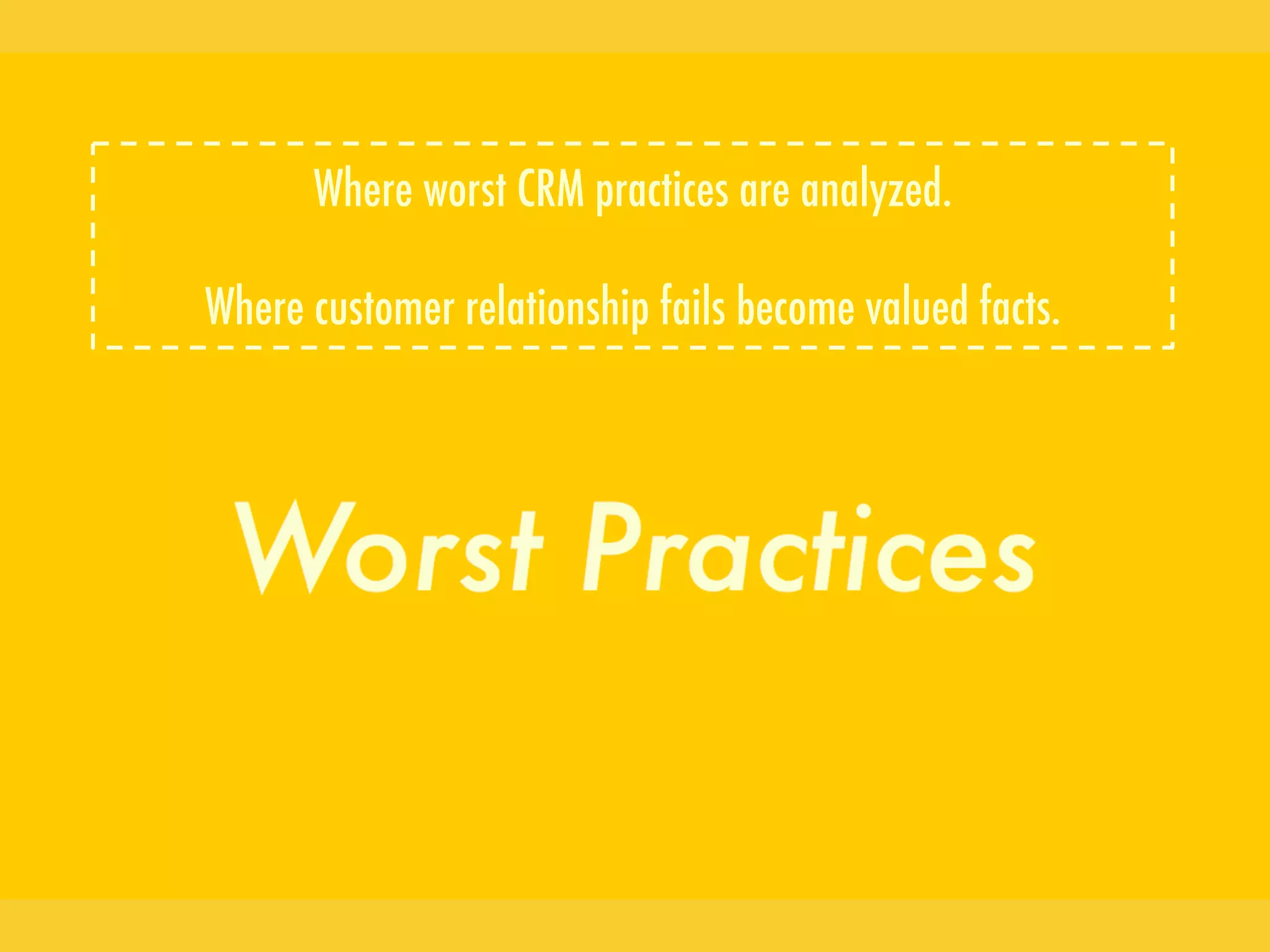 This blog aims to highlight common worst practices in customer relationship management (CRM) by sharing real customer experiences. Readers are encouraged to submit 500-word articles describing a CRM failure they experienced along with possible improvements. Examples of topics include failed customer loyalty programs, poor social/community management, and ineffective crisis response. The goal is to learn from failures and help companies avoid similar mistakes in their own CRM strategies.