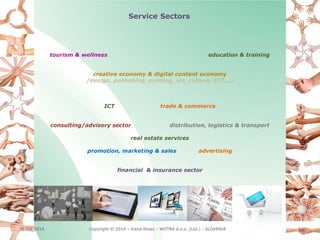 The document discusses various service sectors that are well-suited for collaboration, including tourism, education, creative industries, ICT, consulting, real estate, and finance. It then provides information about WOTRA Strategic Intelligence Ltd., a company that specializes in strategic management, business networking and clustering, business support services, and monitoring future trends across these sectors. WOTRA aims to innovatively contribute to the development of new business, organizational and research models through activities like information provision, consulting, training, marketing and research.