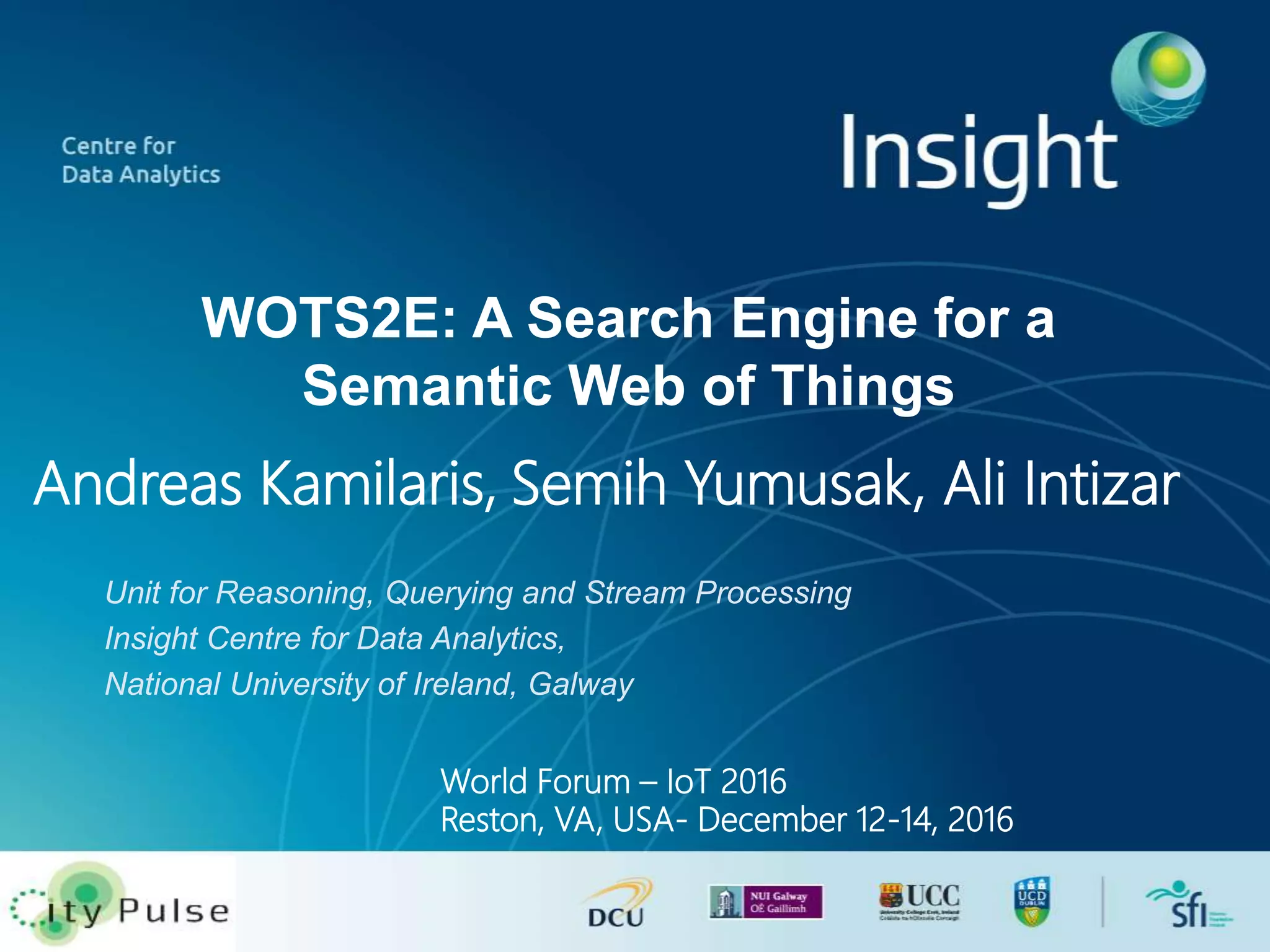 WOTS2E is a search engine designed for the Web of Things (WoT) that aims to enhance the discoverability of IoT devices using semantic technologies and global indexing. It involves a comprehensive architecture for automatic discovery, indexing, and metadata analysis of linked IoT data sources, utilizing techniques like SPARQL queries and semantic annotations. The project addresses the current limitations in IoT data accessibility and emphasizes the need for standardized discovery mechanisms, proposing improvements for better search and integration of devices.