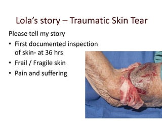 This document provides information and guidance on wound care products and pressure injury management from Nicole Walsh, a Nurse Practitioner in Wound Management. It discusses dressing products like Mepitel silicon mesh and calcium alginate for skin tears. It also summarizes pressure injury data from SCGH in 2014, finding a prevalence of 5.3%, lower than the state average of 5.7% but higher than previous years. Key findings were gaps in skin assessment documentation and a lack of identified pressure injuries being documented in patient notes. Prevention strategies are needed to improve documentation and reduce injury rates.