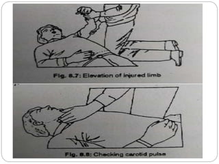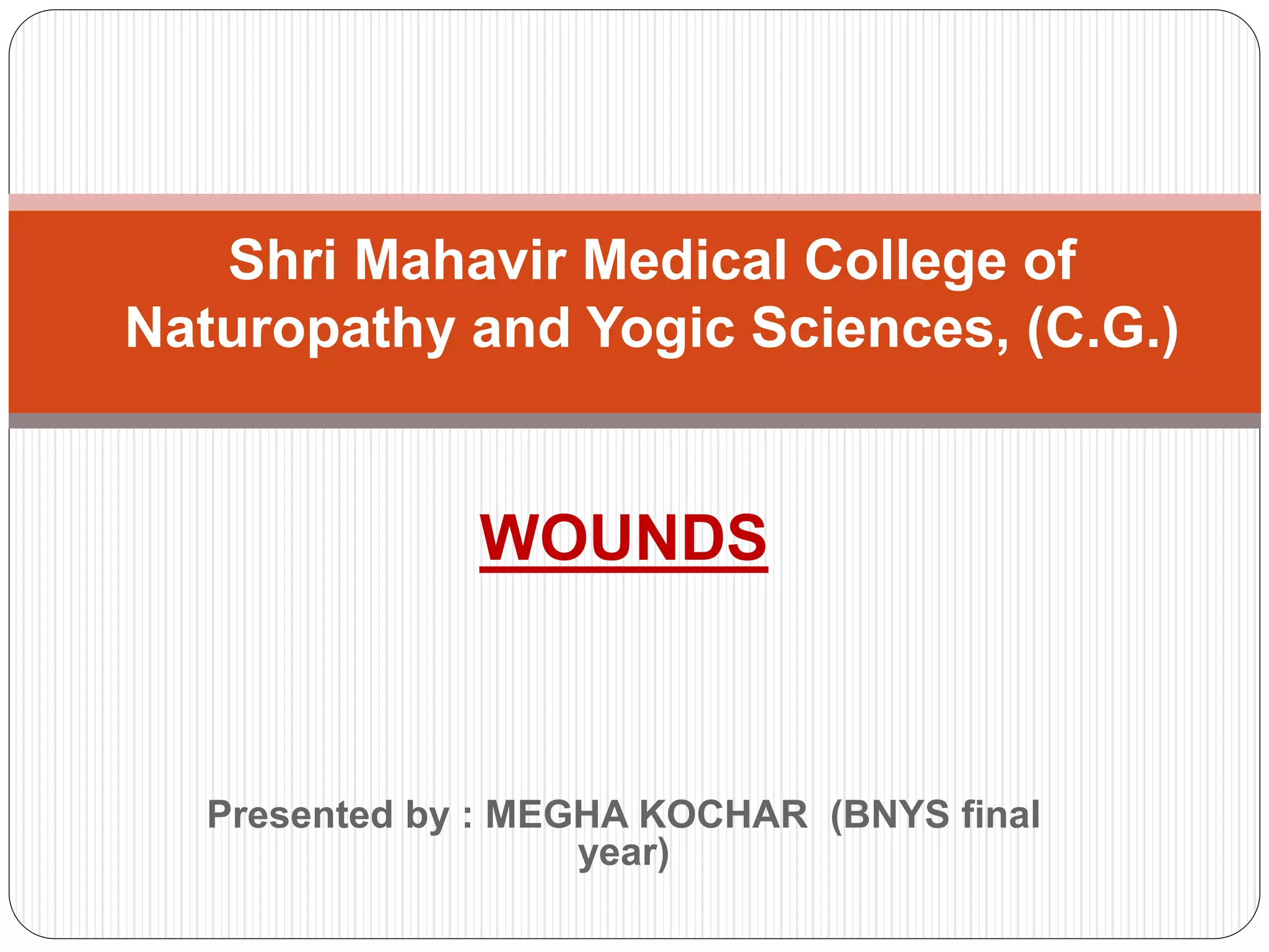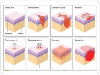 This document provides information on different types of wounds, including definitions, classifications, etiology, risk factors and management. It discusses open and closed wounds, as well as lacerations, abrasions, and puncture wounds. Specific wound types like those on the palm, abdomen, and chest/back are described. Wound healing factors, complications and infection signs are outlined. Management includes controlling bleeding, dressing/bandaging, immobilization, and treating shock. Infected wounds require cleaning and application of antiseptic solutions.