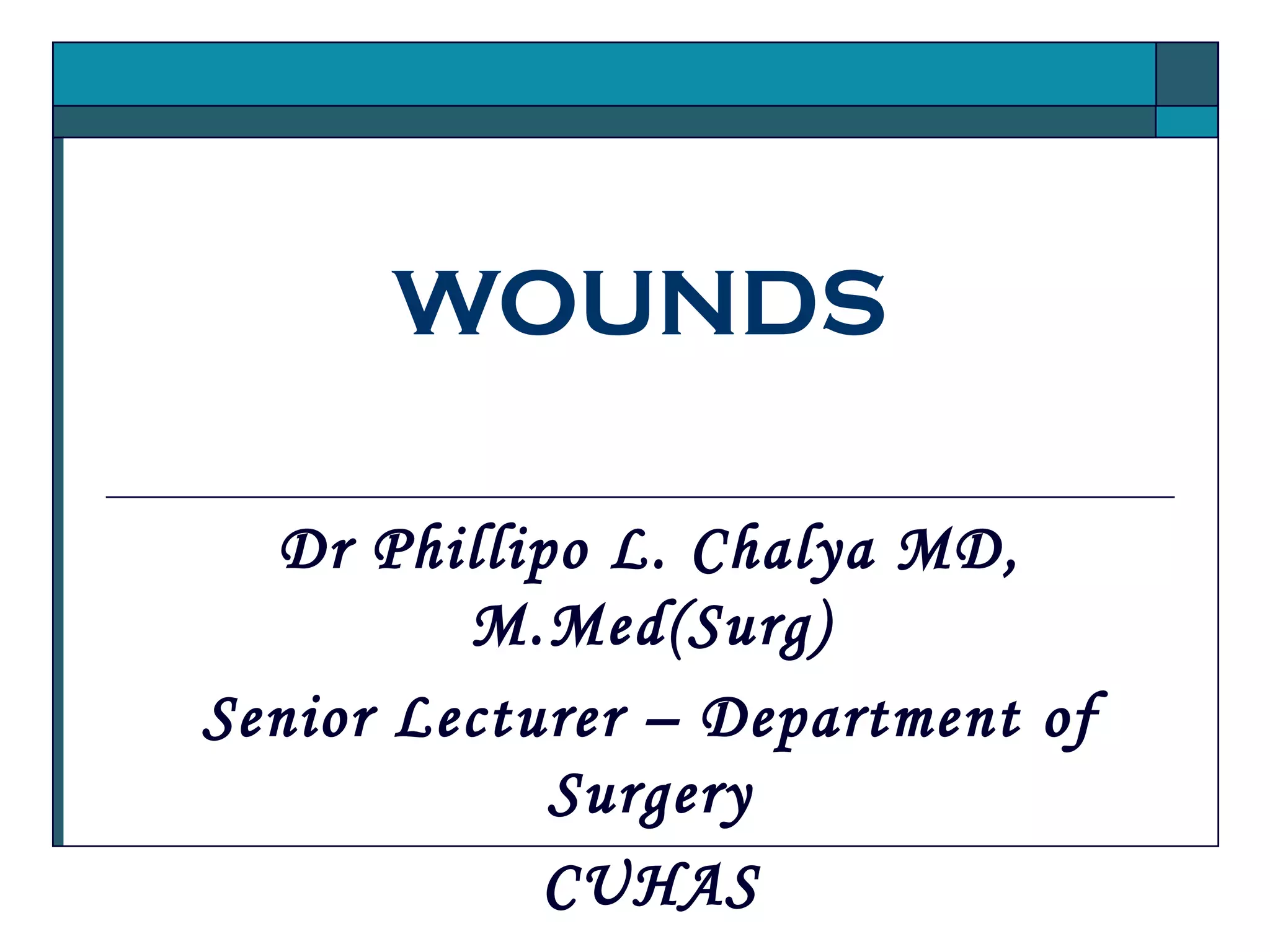 The document discusses various aspects of wounds, including their definitions, classifications, and the healing process. It outlines the types of wounds such as blunt, penetrating, surgical, and burn injuries, and describes the wound healing phases: inflammatory, proliferative, and maturation. Additionally, it covers factors affecting wound healing, potential complications, and management strategies.
