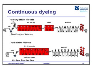 This document provides information about various textile dyeing and finishing machines. It begins with an introduction to dyeing processes and dyeing machines in general. It then describes several specific types of machines in more detail, including jigger dyeing machines, pad batch dyeing machines, mercerizing machines, sanforizing machines, and thermosol dyeing machines. It also provides examples of dyeing and chemical recipes used with some of these machines. Finally, it lists some popular companies that manufacture dyeing and finishing equipment.