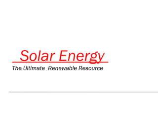 Solar energy is the ultimate renewable resource provided by the sun. It comes in the form of solar radiation and can be harnessed using technologies like solar cells, solar cooking, and solar water heating. Solar energy is a sustainable source that does not pollute the environment or produce greenhouse gases. While the sun does not shine consistently, solar power can be collected, converted, and stored for use. Solar energy applications are ready today for homes, businesses, and industry, and it will certainly play an important role in the future.