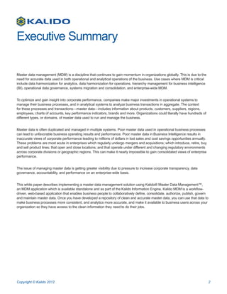 This document provides an overview of master data management (MDM) and describes how the Kalido MDM solution addresses common MDM challenges. It discusses how master data is critical context for business processes and analytics but is often inconsistent across systems. The Kalido MDM solution enables businesses to consolidate, govern, and maintain master data through capabilities like managing all data domains, sophisticated data modeling, a master data authoring environment, life cycle management, data matching, hierarchy management, and embedded workflow to guide the data stewardship process.