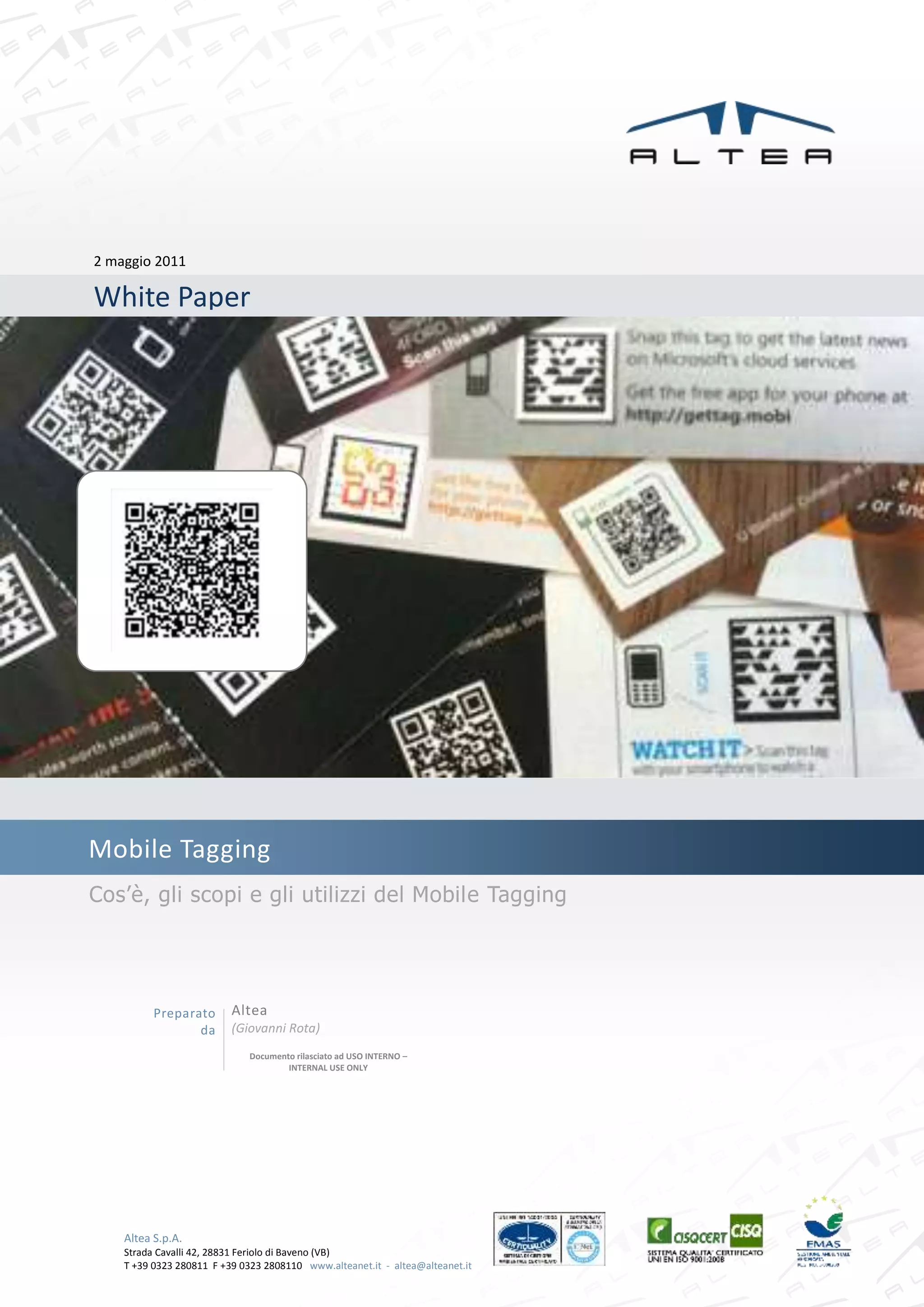 Il documento esplora il concetto di mobile tagging, definendolo come la fornitura di dati tramite codici a barre bi-dimensionali leggibili con dispositivi mobili. Viene discusso l'impiego dei QR code, Microsoft Tag e altri codici a barre, evidenziando le loro applicazioni nel marketing e nella gestione dell'informazione. Si sottolinea l'importanza del mobile tagging nelle strategie di interazione tra aziende e clienti, migliorando l'esperienza d'acquisto e la soddisfazione post-vendita.