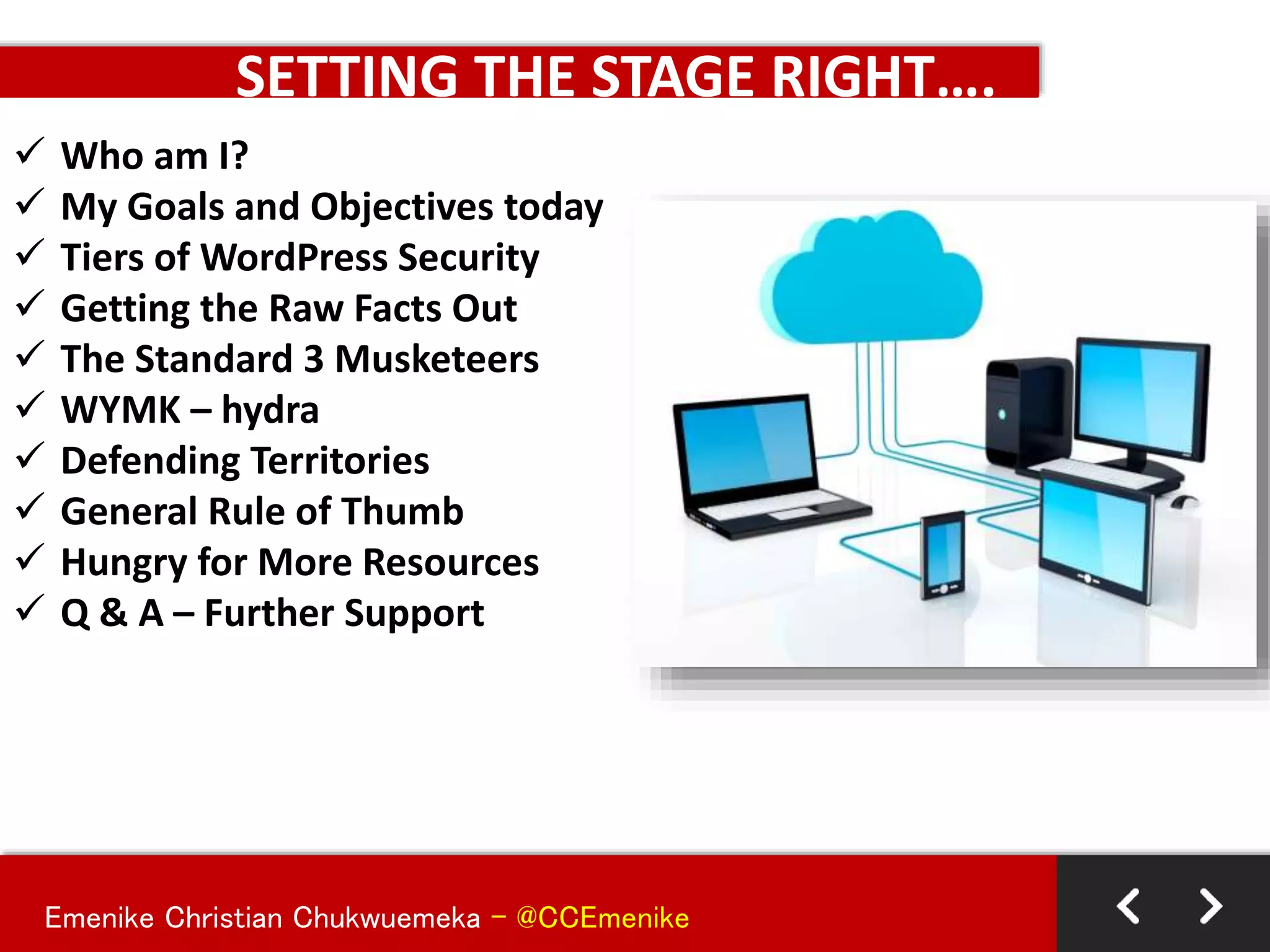 The document discusses best practices for securing WordPress sites. It begins by introducing the speaker and their goals for the presentation. It then covers tiers of WordPress security for beginner, intermediate, and advanced users. The main body discusses the 3 musketeers of security - protection, detection, and recovery. It provides tips on securing various aspects like passwords, hosting, plugins, and more. It emphasizes the importance of updating, backups, and choosing secure plugins and hosts. The document aims to increase awareness of WordPress security.