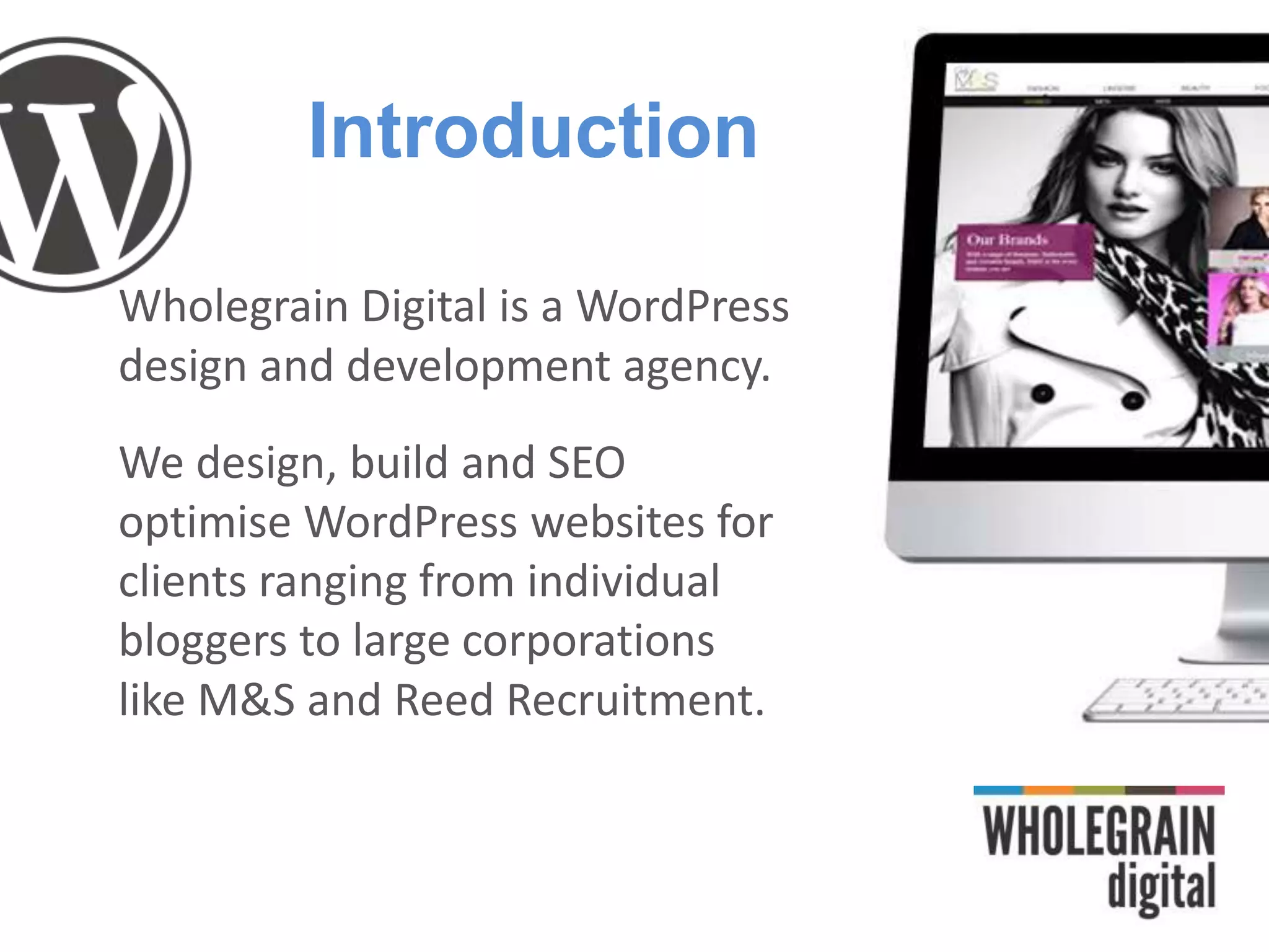 Wholegrain Digital is a WordPress design and development agency that designs, builds, and optimizes WordPress websites for clients ranging from individual bloggers to large corporations. WordPress is a content management system that provides an easy way to add and edit content on a website. It is popular, with a 54.6% market share of content management systems used by 17.4% of all websites. Reasons to use WordPress include that it is easy to use, free, flexible, has a large community, and Google recommends it for SEO.
