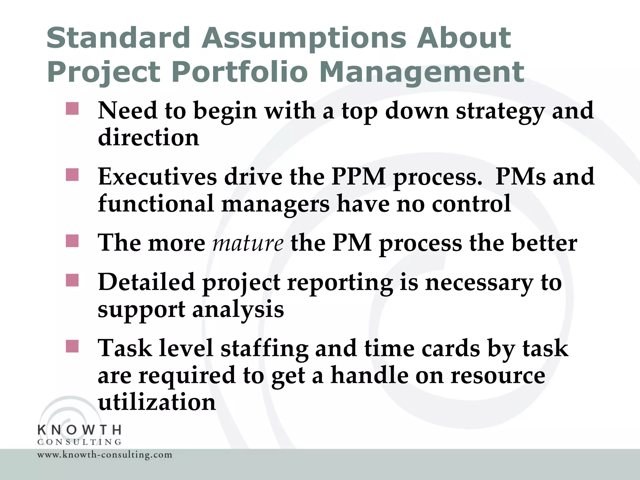 The document introduces a scalable project portfolio management (PPM) approach that is intended to be culturally neutral and support both top-down and bottom-up management. It emphasizes communication, risk management, and value-based decision making. The scalable PPM process involves defining measurements, determining strategy, selecting projects, allocating resources, analyzing the current state, balancing resources, eliminating non-value adding projects, executing projects, and reporting on performance. The benefits of this approach include aligning the PPM process to an organization's culture without sacrificing efforts, allowing strategic input from all management levels, and making decisions based on value.