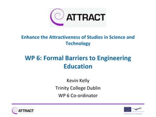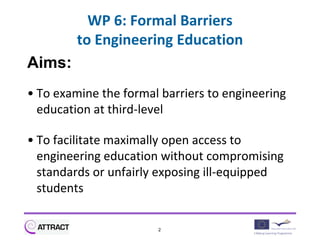 The document outlines the formal barriers to engineering education at the tertiary level, highlighting challenges such as high school systems, university entry requirements, and socio-economic factors that limit access to engineering programs. It details a three-phase analysis involving surveys, a comparison framework, and a report on the identified barriers, emphasizing the need for structural changes and tailored recommendations to enhance access and encourage diversity in engineering education. The recommendations focus on admission standards, educational structure adjustments, and addressing socio-cultural issues to foster a more inclusive STEM environment.