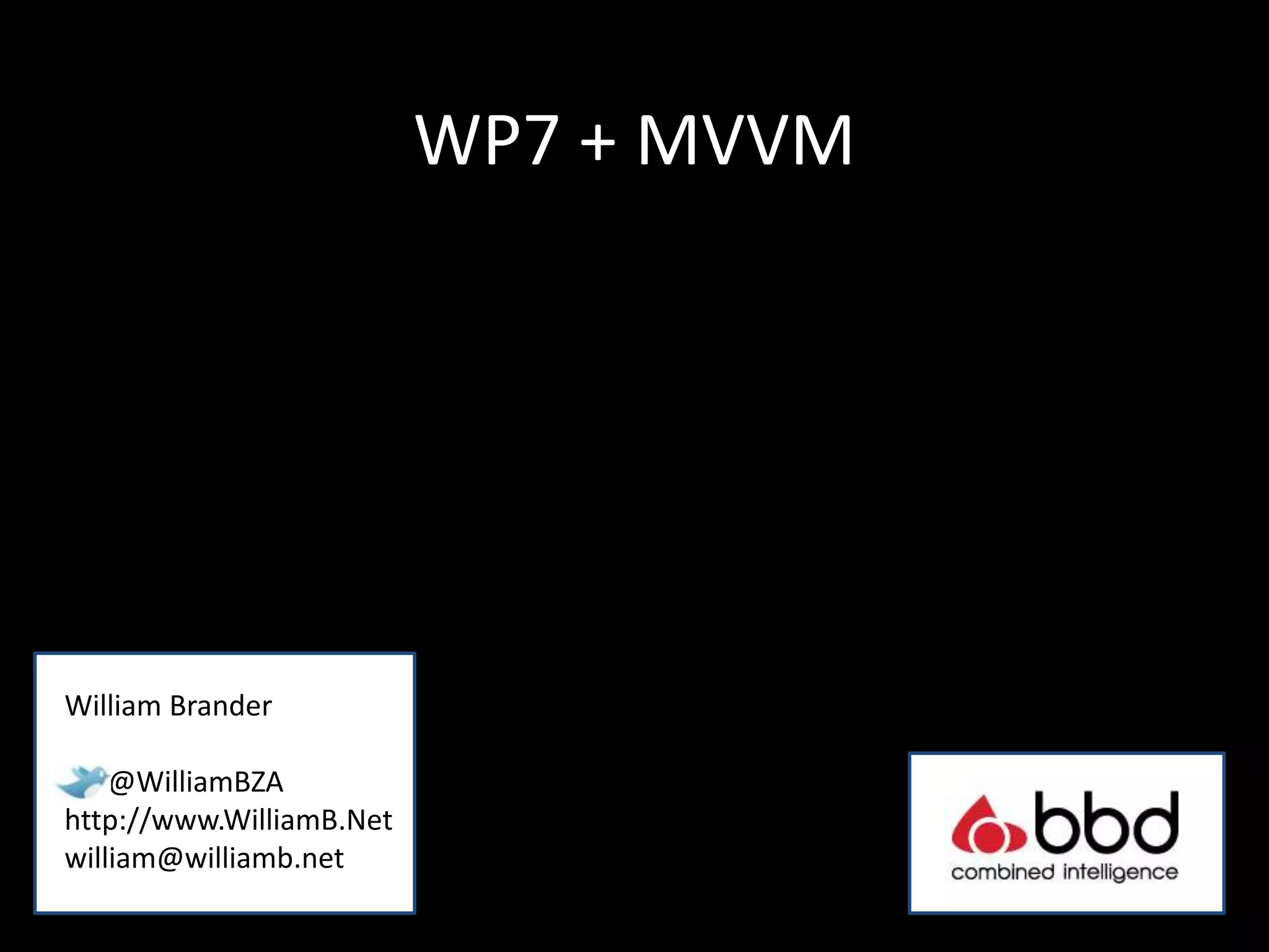 The document discusses Model-View-ViewModel (MVVM) as an architectural pattern for building user interfaces. It describes some issues with traditional MVC/MVP approaches and introduces MVVM as a more testable alternative that separates the model and view using a view model layer. The document then evaluates different implementations of MVVM, highlighting features like messaging, commanding, and dependency injection provided by frameworks like Caliburn.Micro to help realize the MVVM pattern. It concludes by asking if the audience has any other questions.
