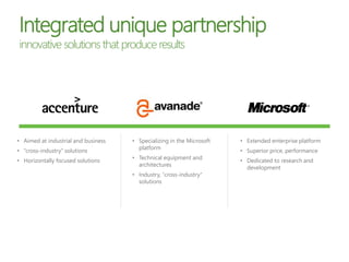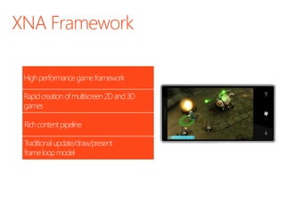 The document provides an overview of the Windows Phone 7 platform, including its architecture, components, tools, and development lifecycle. It discusses the integrated user experiences, Metro UI, support for cloud services, and development using Silverlight, XNA, and .NET. The platform aims to enable faster app development, richer experiences, and prioritizes the end user. It also touches on Avanade's expertise in application development and their global presence.