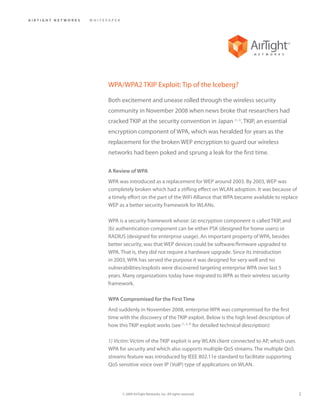 The whitepaper discusses the discovery of a TKIP exploit affecting WPA wireless security, marking the first time enterprise WPA has been compromised since its introduction in 2003. The exploit allows attackers to inject arbitrary packets into a WLAN client under certain conditions, posing a potential threat to wireless networks that support QoS features. It recommends immediate mitigations such as disabling QoS, reducing TKIP key rotation intervals, implementing wireless intrusion prevention systems, and migrating to WPA2 with AES encryption to prevent exploitation.