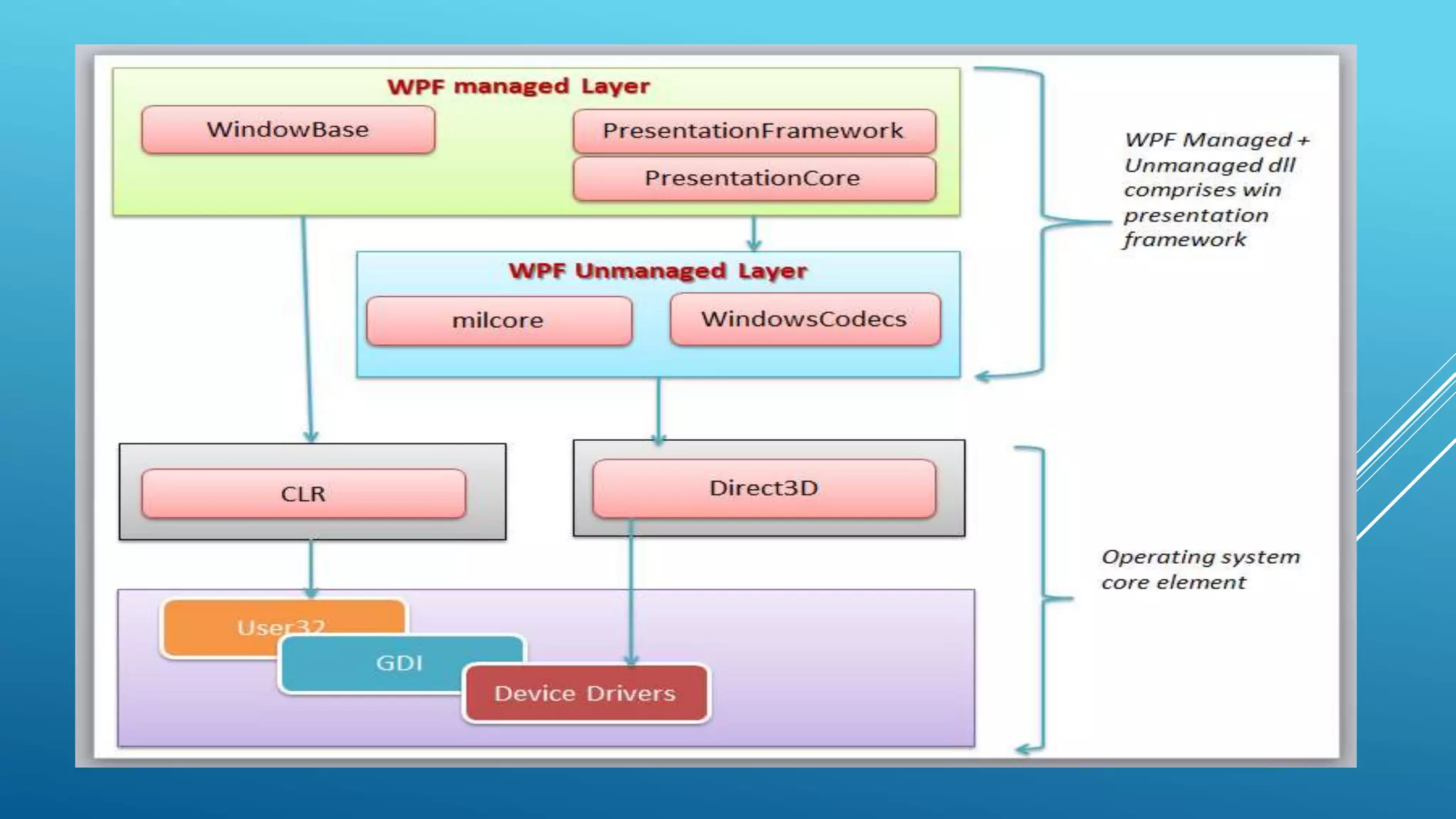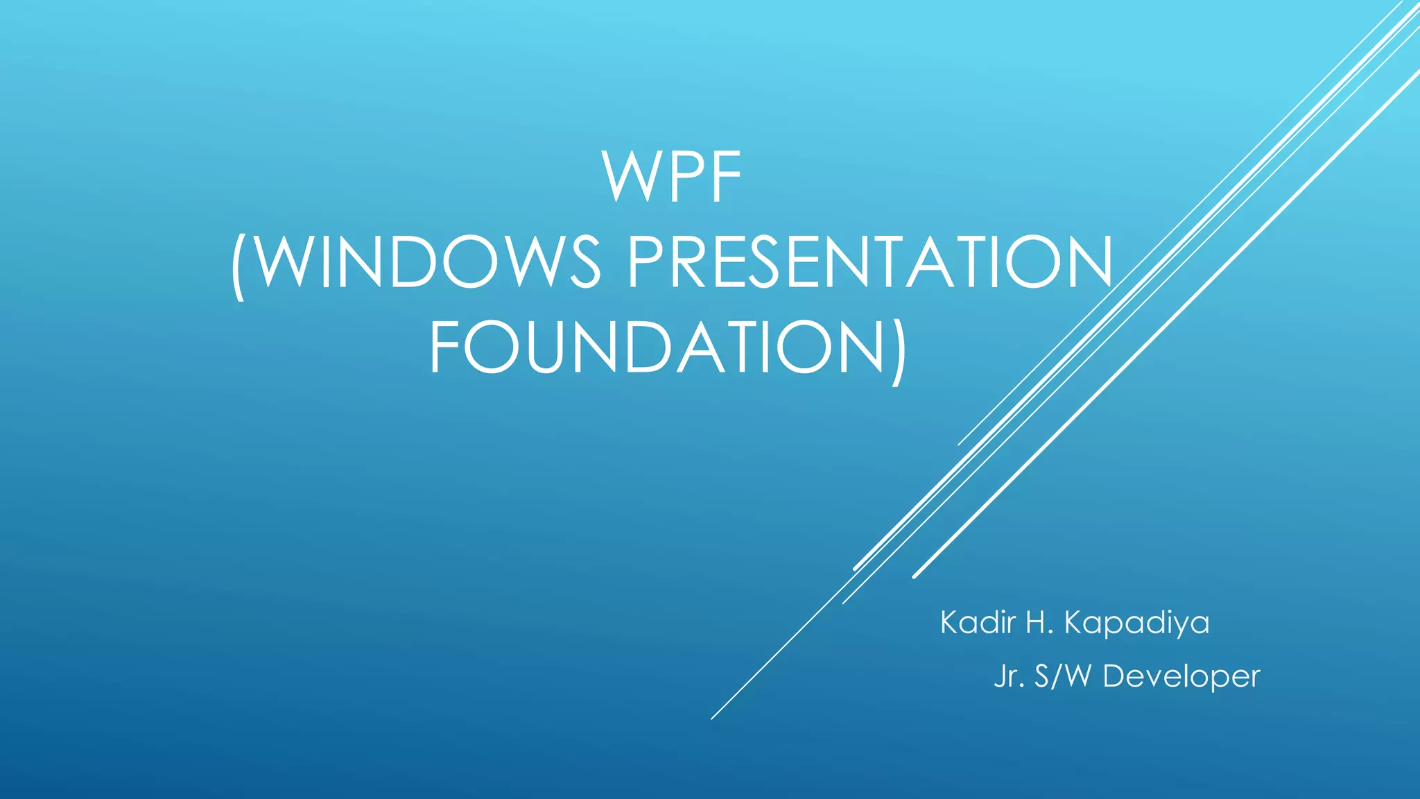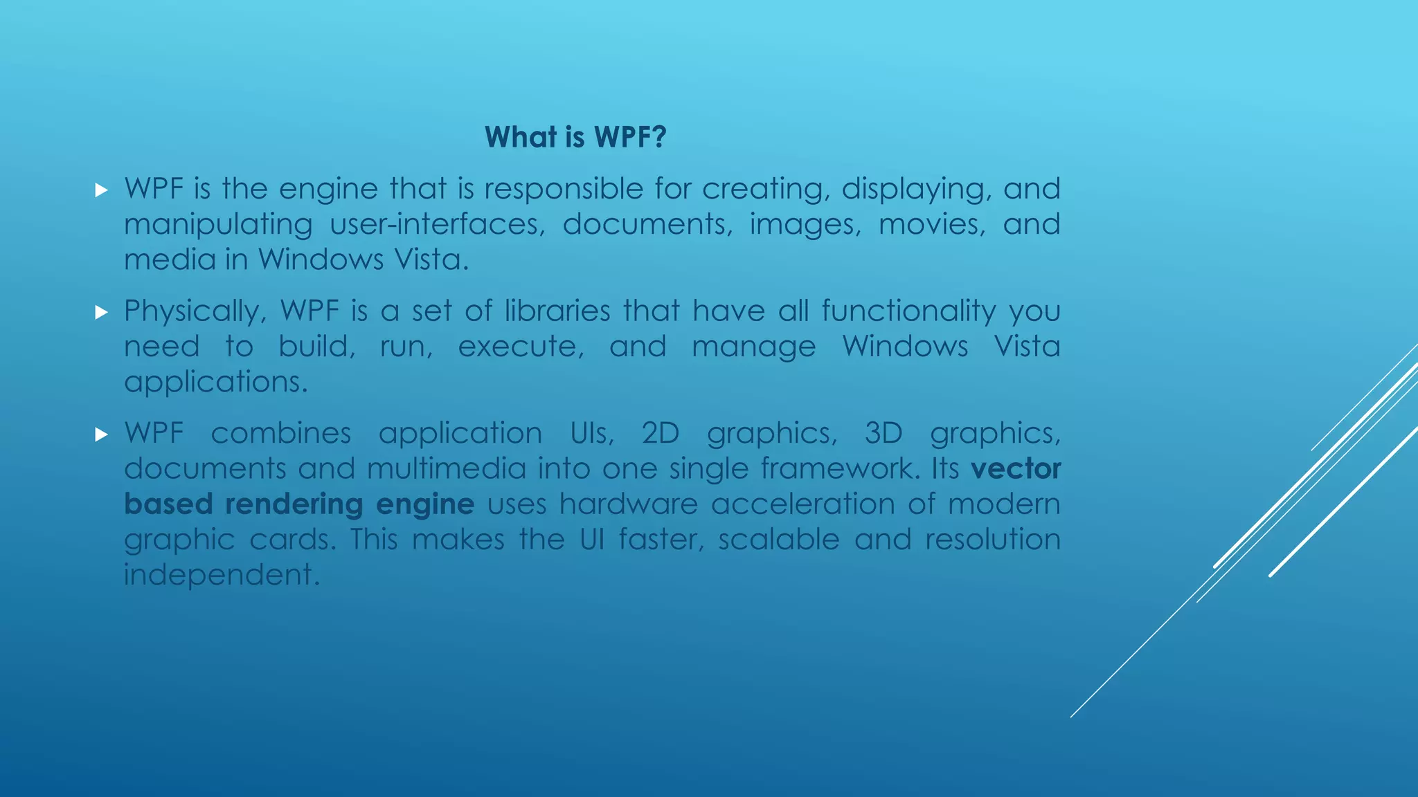 WPF (Windows Presentation Foundation) is a framework for building desktop client applications in Windows Vista and .NET Framework. It combines 2D and 3D graphics, documents, user controls and multimedia into a single framework. WPF uses hardware acceleration and vector graphics to make applications faster, scalable and resolution independent. It separates user interface design from programming logic using XAML and data binding. The WPF architecture includes managed and unmanaged layers that communicate with DirectX and the Windows API to render applications.