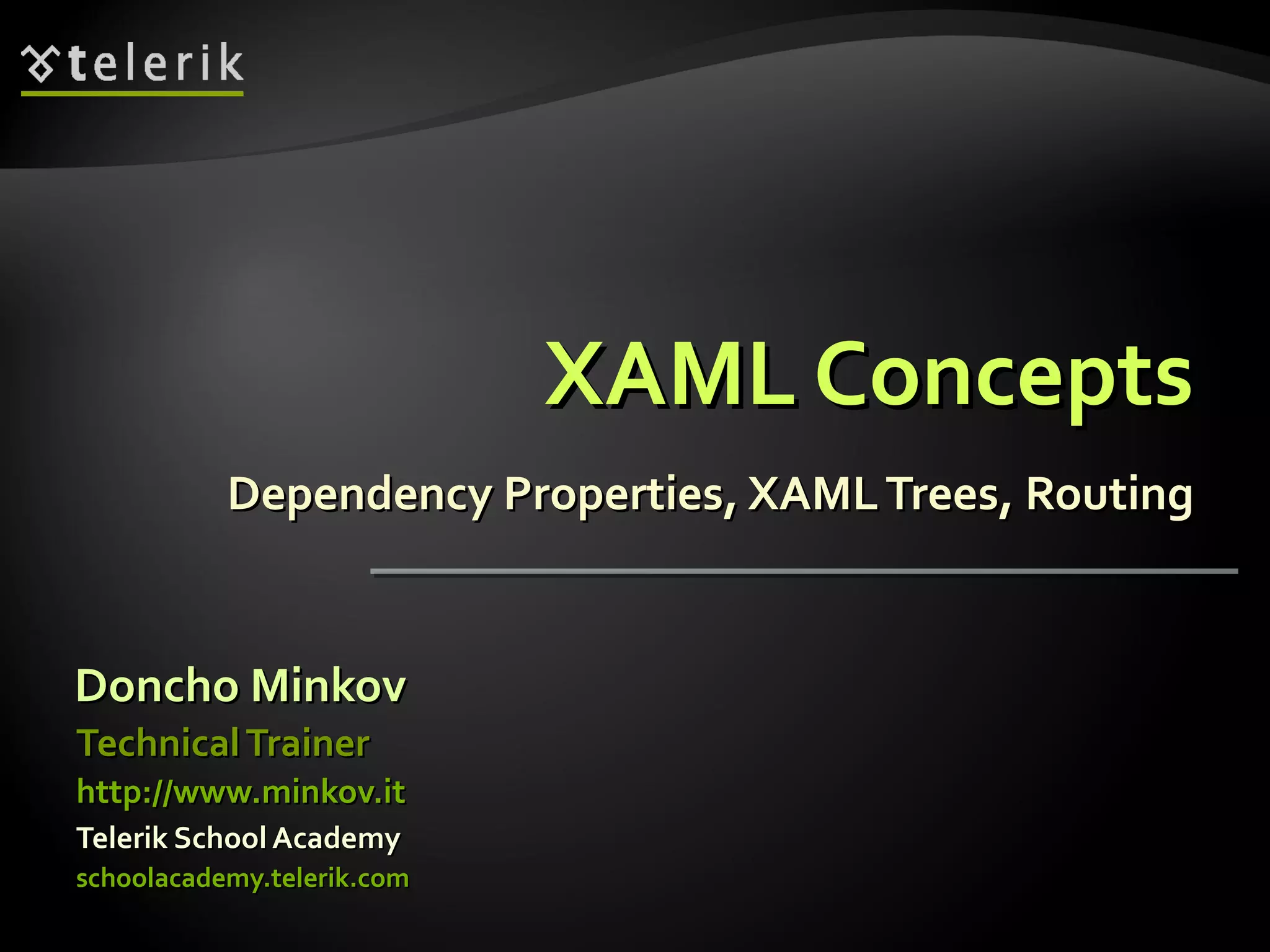 This document discusses key XAML concepts including dependency properties, trees in XAML/WPF/Silverlight, routing events, and commanding. It defines dependency objects and properties, describes the visual and logical trees, and covers attached properties, custom dependency properties, traversing trees, and implementing commands using interfaces like ICommand and RelayCommand. Live demos are provided for many of these concepts.