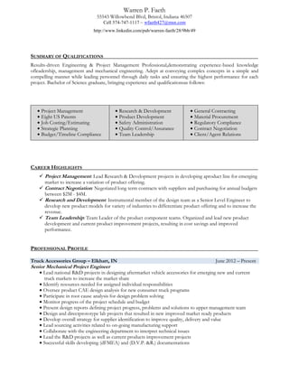 This document contains a summary of qualifications and experience for Warren P. Faeth, an engineering and project management professional. Over his 30+ year career, he has held several senior engineering and project management roles developing products for the automotive, trucking, and petroleum industries. He has a bachelor's degree in mechanical engineering technology and holds 8 US patents. His experience includes project management, research and development, product design, team leadership, contract negotiation, and client relations.