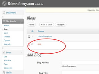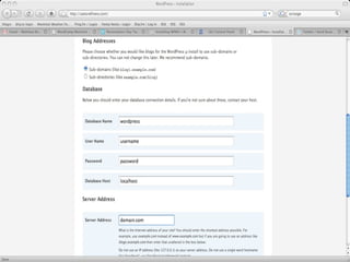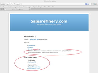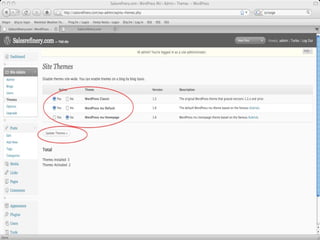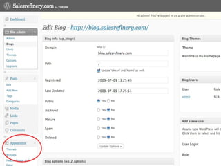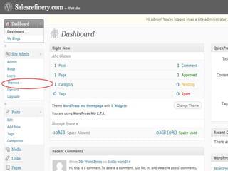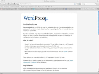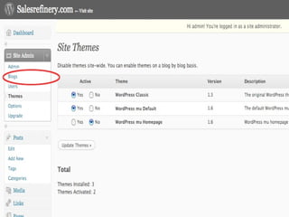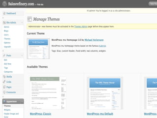 The document provides a guide on installing WordPress Multi-User (WP-MU), highlighting its capabilities such as handling unlimited users and blogs and its application in various sectors like newspapers and universities. It details the installation process for both WP and WP-MU, including prerequisites and configuration options. The guide addresses common mistakes and includes information on theme management for different blogs within a WP-MU setup.