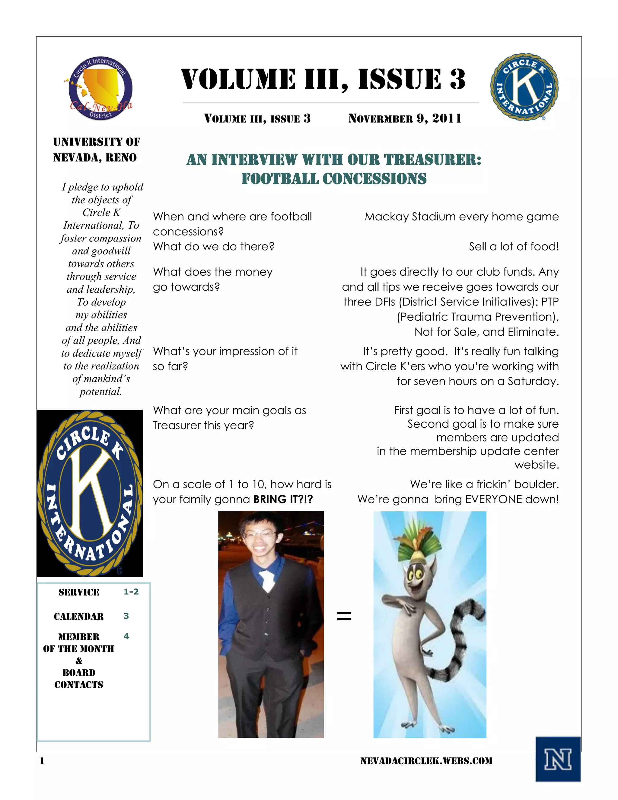 This newsletter provides updates on recent and upcoming service events and fundraisers for the University of Nevada, Reno Circle K club. It highlights their football concessions, a Kiwanis takeover meeting, a successful Red Robin fundraiser, and upcoming volunteer shifts at Special Olympics and St. Vincent's pet food bagging. The member of the month is introduced as Rebecca Fisher, a freshman history major who is passionate about her