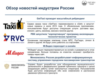 В документе представлены основные события и новости венчурной индустрии за период с 25 апреля по 2 мая 2015 года, включая стратегические шаги таких компаний, как 'м.видео' и 'gettaxi'. Также описаны значимые инвестиции в российском и американском рынках, такие как финансирование проекта Scorista и медицинской компании Scanadu. В частности, упоминается, что Scanadu разрабатывает устройства для мониторинга здоровья, а 'gettaxi' планирует масштабный ребрендинг и новые сервисы.