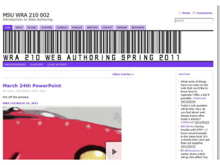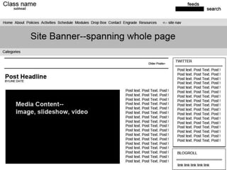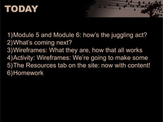 This document provides an overview of upcoming topics and assignments in a design course. It discusses wireframing techniques and an in-class activity where students will work in pairs to create wireframes and color palettes for a mock website based on provided directives. Students are also assigned to finish work on Module 5 and asked to share on Twitter which wireframing style works best for them and why.