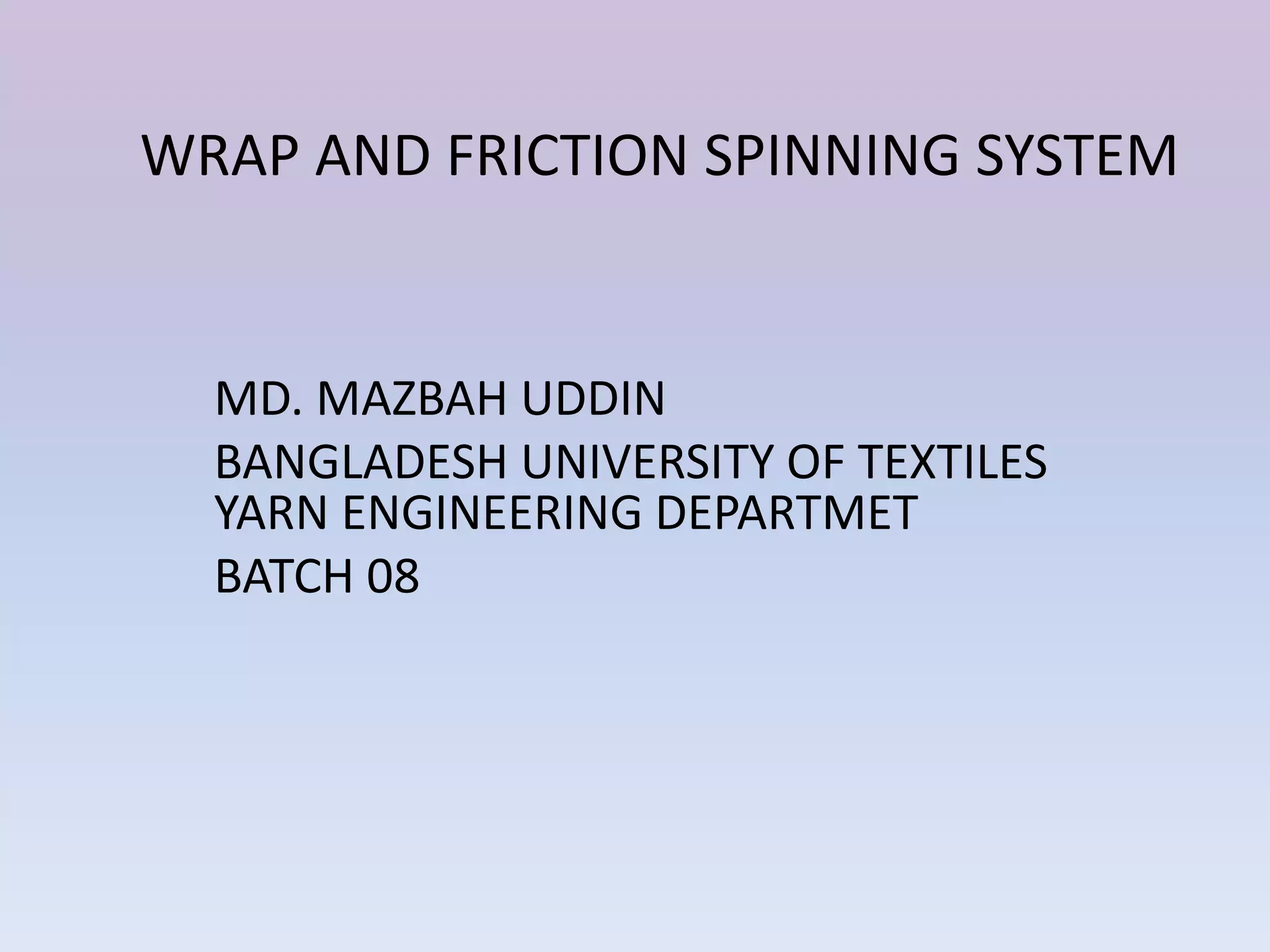 The document discusses wrap spinning and friction spinning systems for yarn production, including descriptions of the wrap spinning and DREF friction spinning processes, their advantages and limitations, end uses of wrap yarns, manufacturers of wrap spinning machines, classifications of friction spinning systems, and features of the DREF-II and DREF-III friction spinning machines.