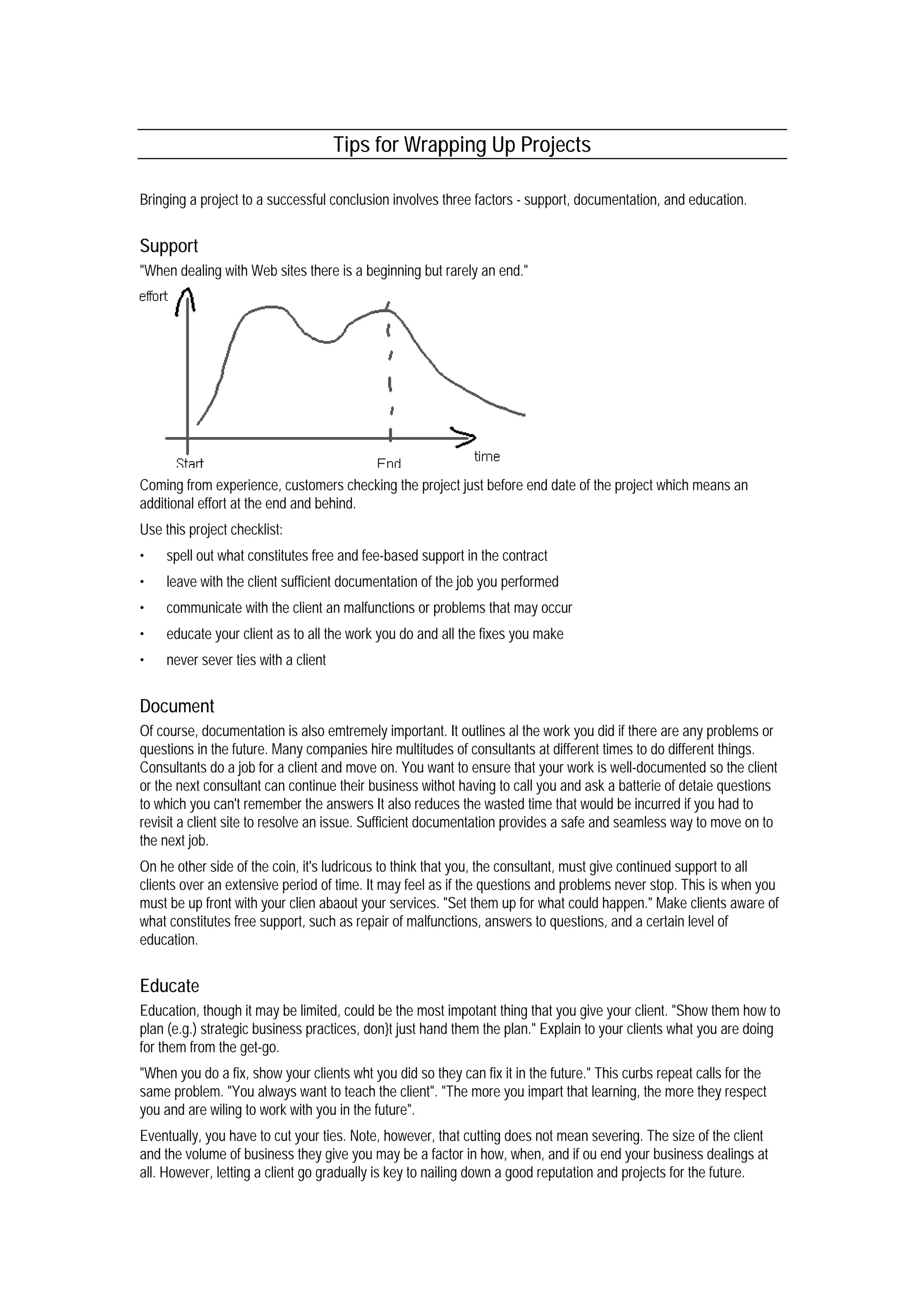 Bringing a project to a close requires supporting clients, thorough documentation, and educating clients. Support involves clearly outlining free and paid support in contracts and communicating potential issues. Documentation outlines all work to address future questions or problems. Education, though limited, teaches clients strategic practices and how to address recurring issues independently. Gradually transitioning clients prepares them for independence while protecting your reputation for future work.