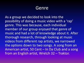 The group decided to do a music video for a rap genre since the members enjoyed rap music and were knowledgeable about it. They narrowed it down to two songs: "In Da Club" by 50 Cent and "Traktor" by Wretch 32. While 50 Cent's video had a higher budget and intricate shots, it would be difficult to replicate those elements with their low budget. Wretch 32's video had a location and mise-en-scene that could be replicated more easily. Additionally, "Traktor" lacked a complex storyline but would be simpler to film due to fewer characters. After analyzing the pros and cons, the group decided "Traktor" by Wretch 32 was most appropriate for their course