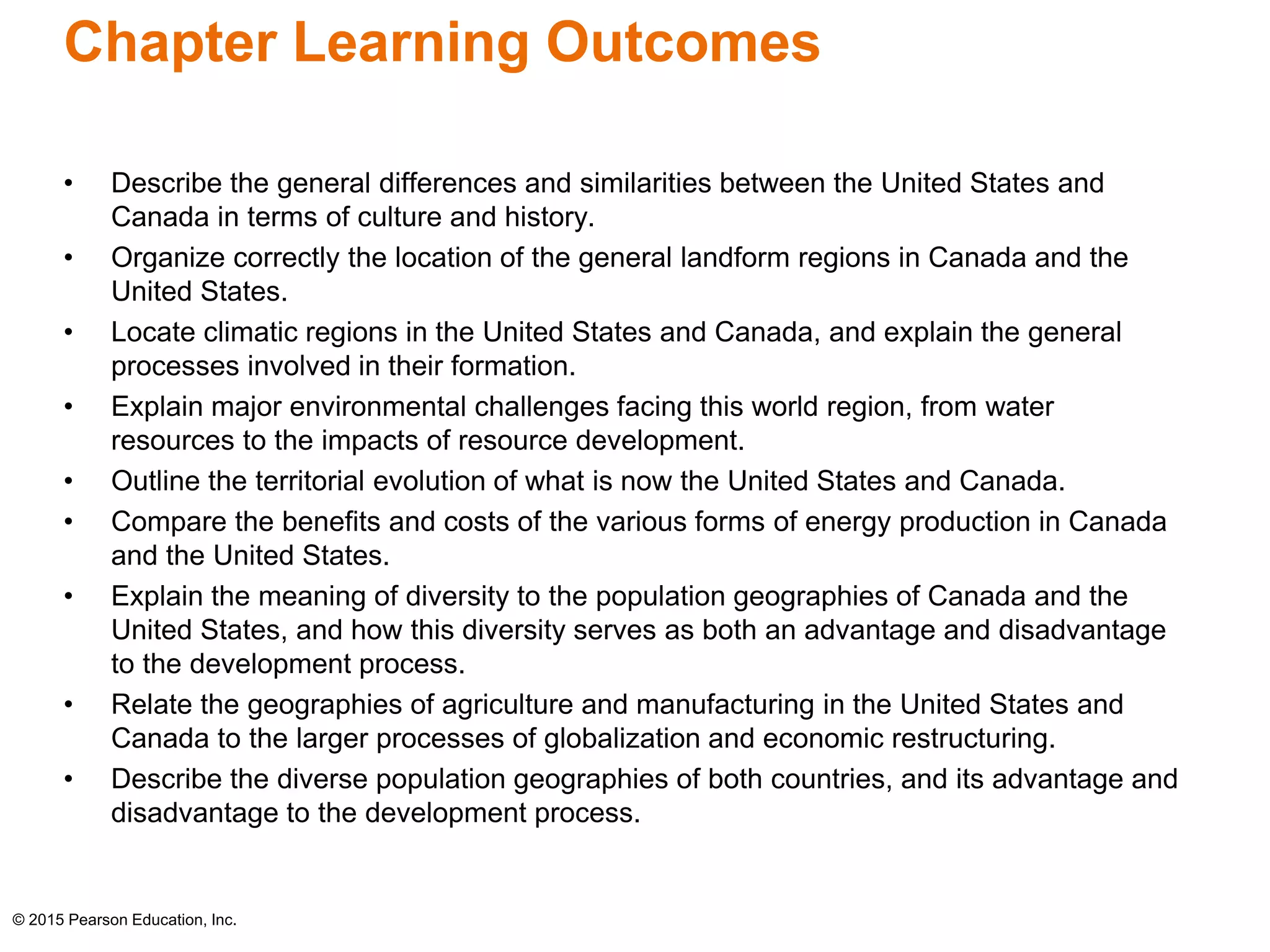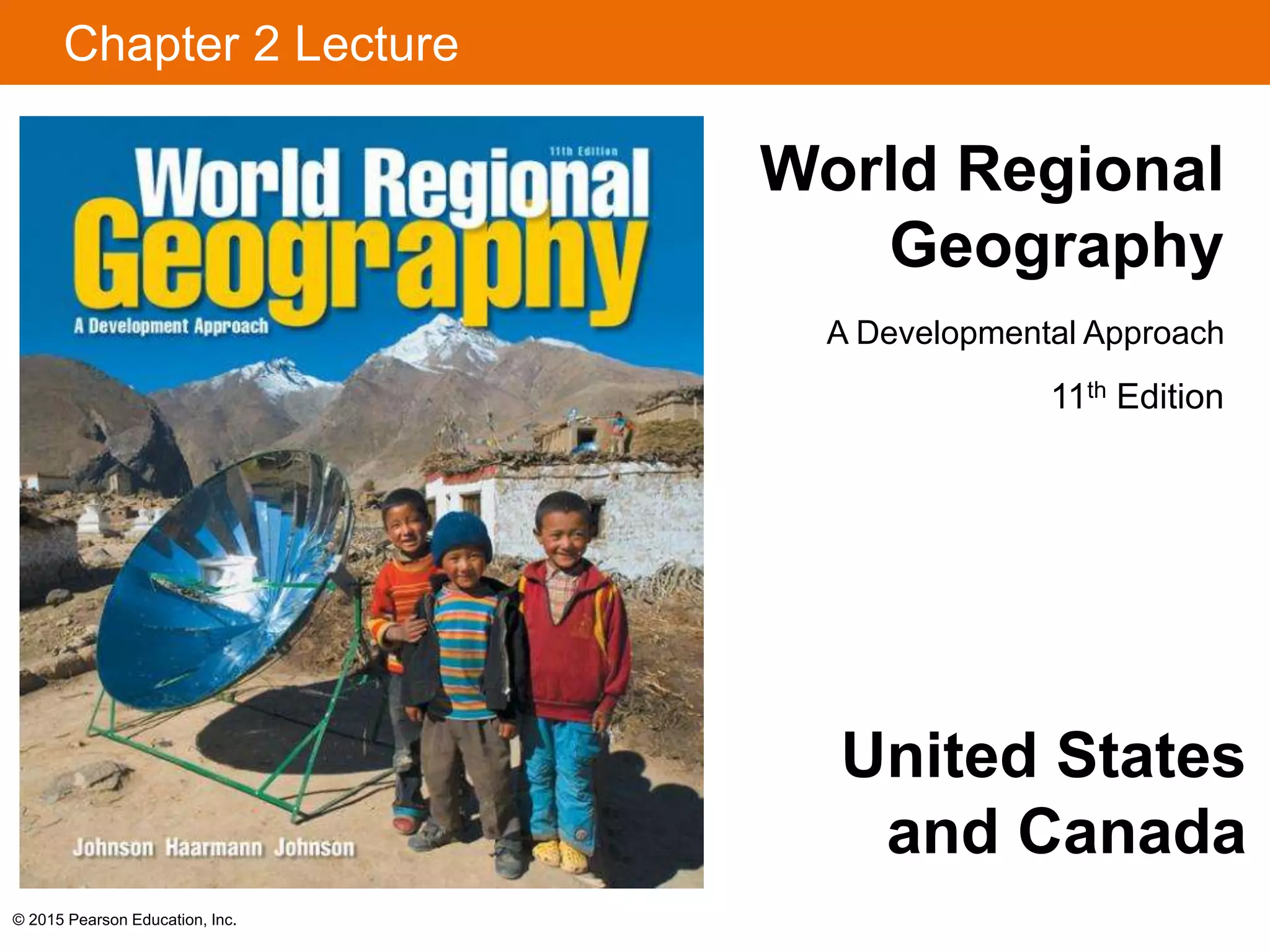 This chapter discusses the geography of the United States and Canada. It covers the countries' landforms, climates, populations, economies, and environmental challenges. Key topics include the various regions defined by landforms and climate, historical settlement patterns, population distributions and diversity, major agricultural and manufacturing regions, urban development, poverty issues, and energy resources. The chapter aims to describe and compare the physical, cultural, economic and demographic landscapes between the two countries.