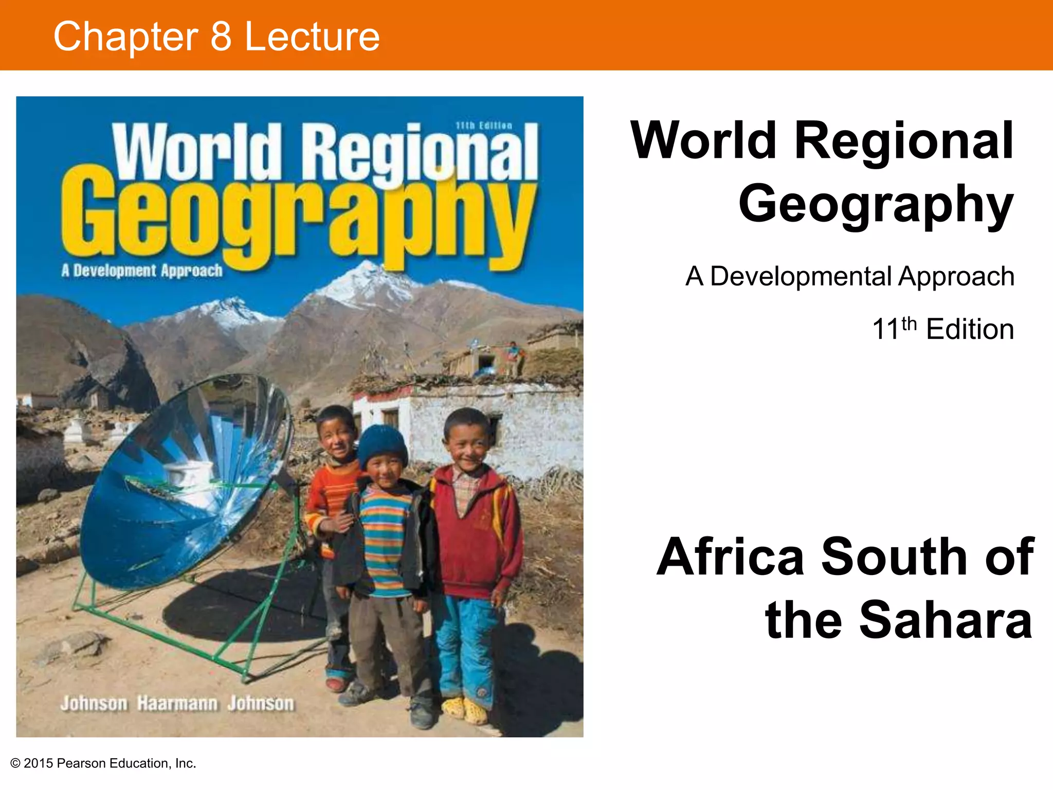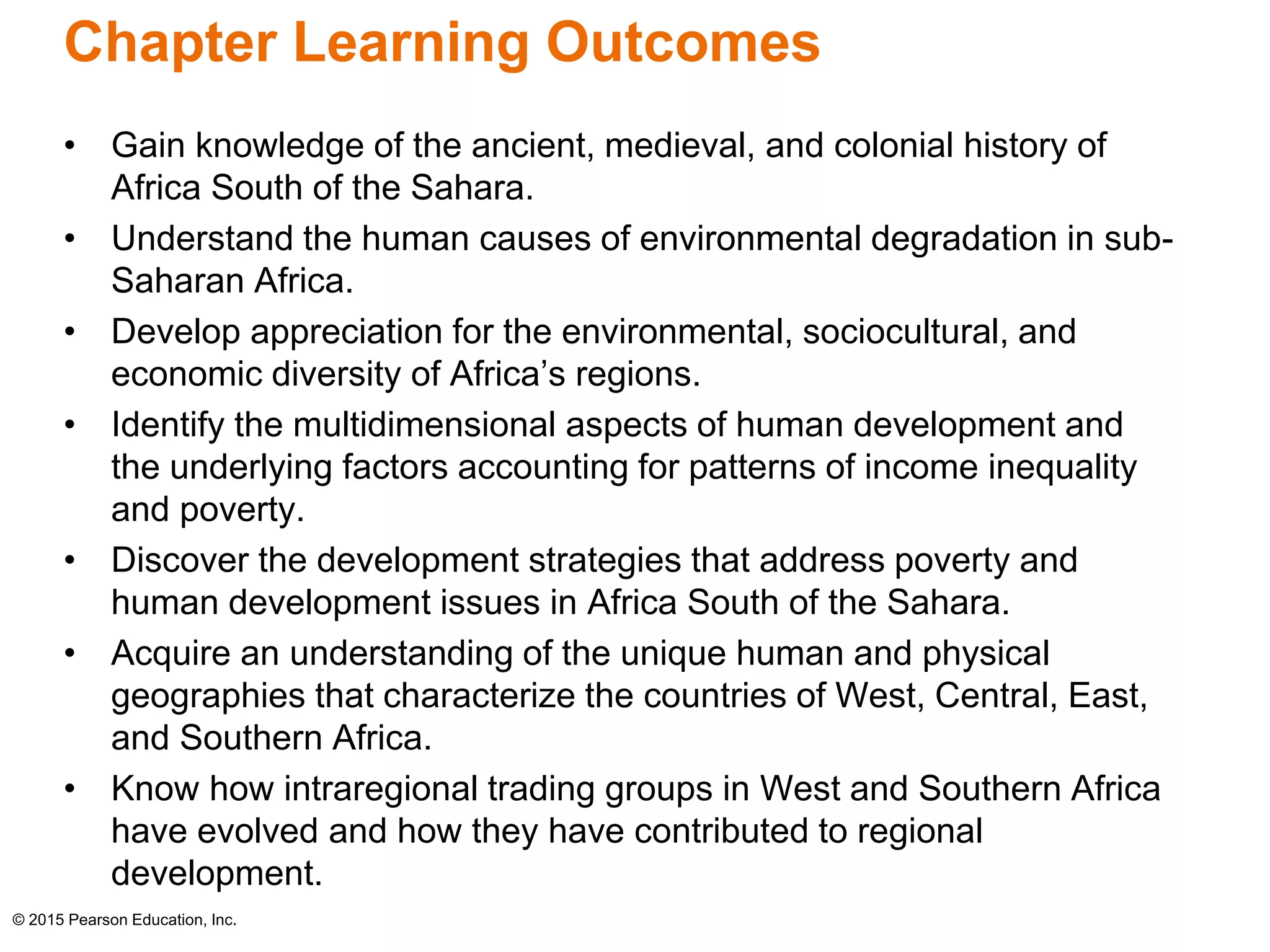 This chapter discusses the history, geography, and development of sub-Saharan Africa. It covers the ancient civilizations, impact of European colonialism dividing the region, challenges of environmental degradation and poverty, and the ongoing efforts for economic cooperation and development. The chapter also examines the diverse regions, countries, and peoples of Africa south of the Sahara while highlighting issues like colonial legacies, uneven development, and strategies to address ongoing development challenges.