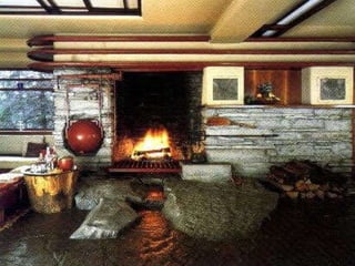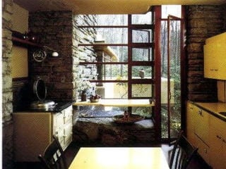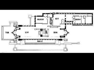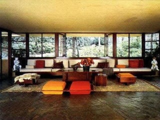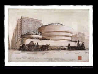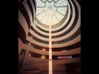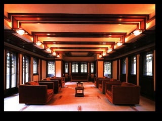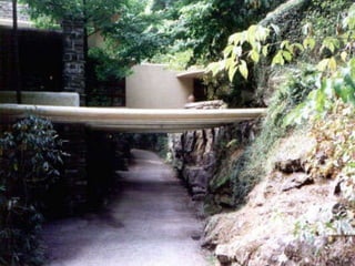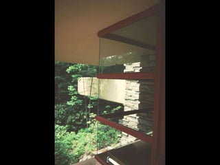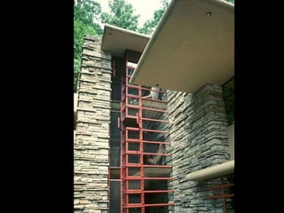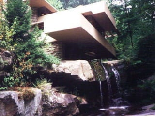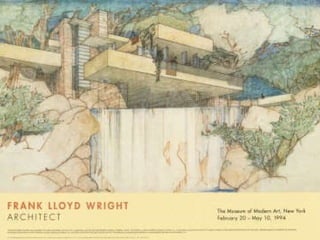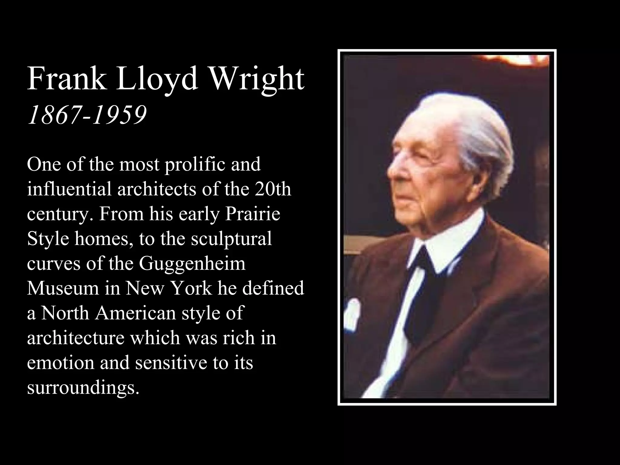 Frank Lloyd Wright was one of the most influential architects of the 20th century known for his Prairie Style homes and sculptural Guggenheim Museum. His Fallingwater house, built in 1935 over a waterfall in Pennsylvania, mimics natural stone ledges and is constructed of local sandstone, with cantilevered concrete trays forming living spaces dramatically over the stream. Additional works include the Guggenheim Museum in 1959 and Roby House in 1906, and Wright often designed internal furnishings as well.