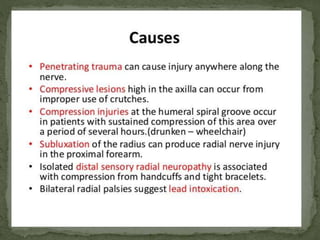 This document discusses radial nerve palsy, which is an injury to the radial nerve resulting in impaired nerve function and causing wrist drop. Wrist drop is the characteristic clinical sign where the wrist hangs flaccidly and cannot be extended. Causes of radial nerve palsy include sleeping with one's arm compressed (e.g. Saturday night palsy from falling asleep with one's arm on a chair or bar), compression from walking with a crutch (crutch palsy), or from another person sleeping on one's arm (honeymoon palsy). Radial nerve palsy results in weakness of wrist and finger extension and grip. Treatment involves reducing pain, increasing range of motion, and restoring