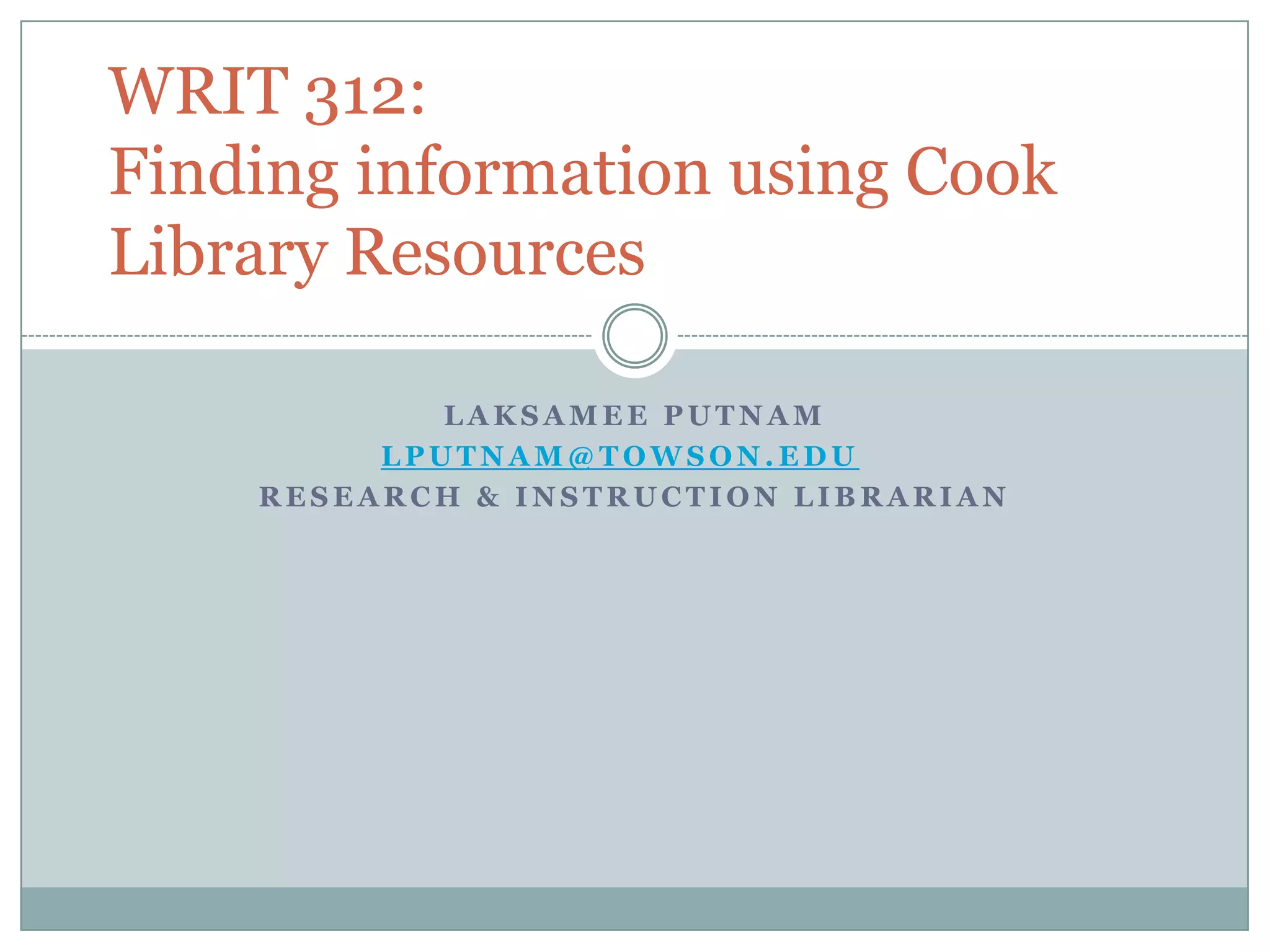 This document provides an overview of Laksamee Putnam's library instruction session on finding information using Cook Library resources for WRIT 312 students. It introduces library resources like databases, search tips, evaluating sources, and citation help. It demonstrates how to search the library catalog and databases for scholarly articles on a given topic. Tips are provided on evaluating web and scholarly sources. Students are instructed to do a guided search of the literature, find a source to cite, and ask any questions. Contact information is provided for Laksamee and reference librarians for additional help.