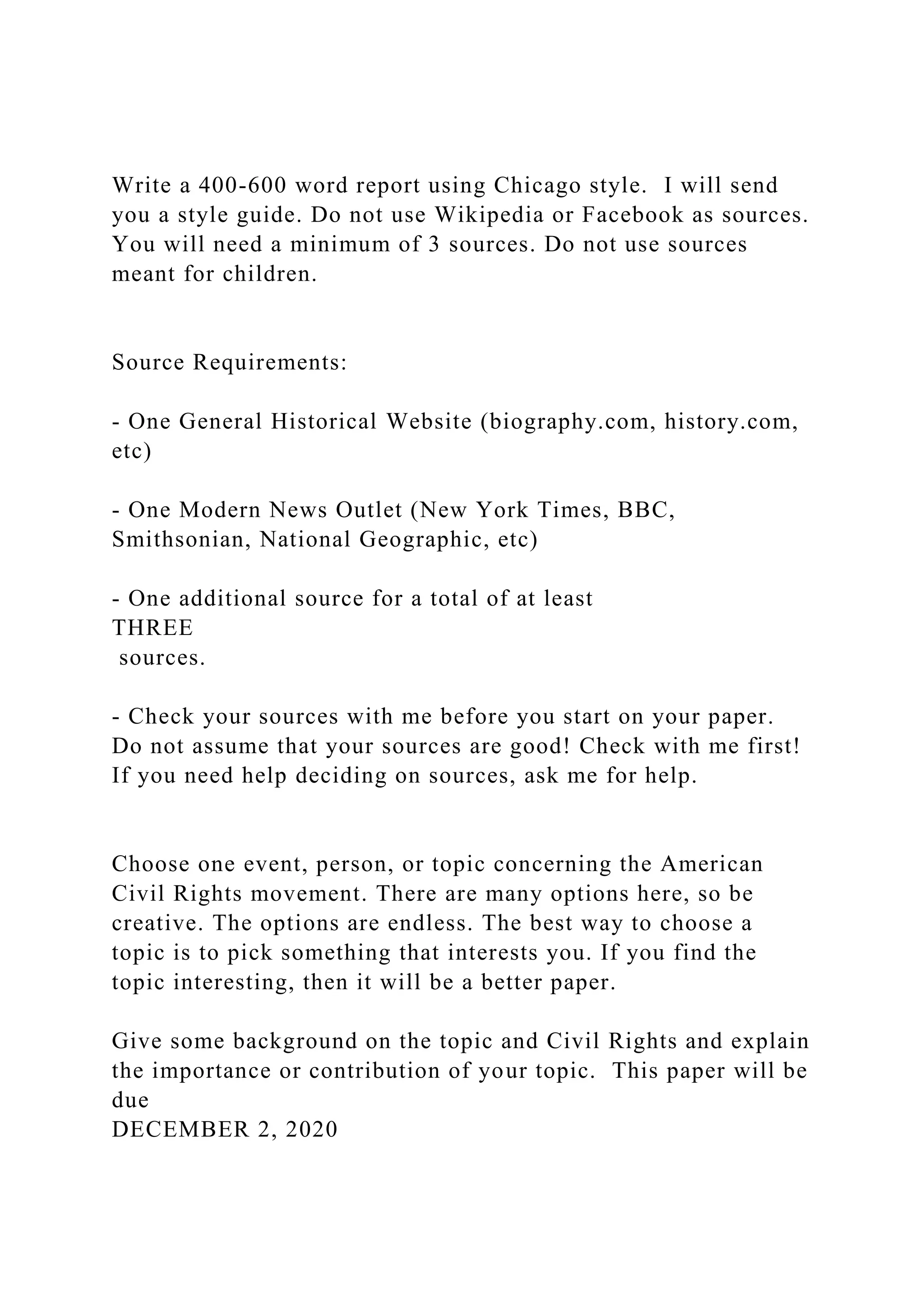 The document outlines the requirements for a report on a topic related to the American Civil Rights Movement, specifically emphasizing the need for a minimum of three credible sources, including a historical website and a modern news outlet. It mandates the use of the Chicago style for writing and prohibits the use of unsatisfactory sources, requiring prior approval. The report is due on December 2, 2020, and must be double-spaced in 12-point Times New Roman font.