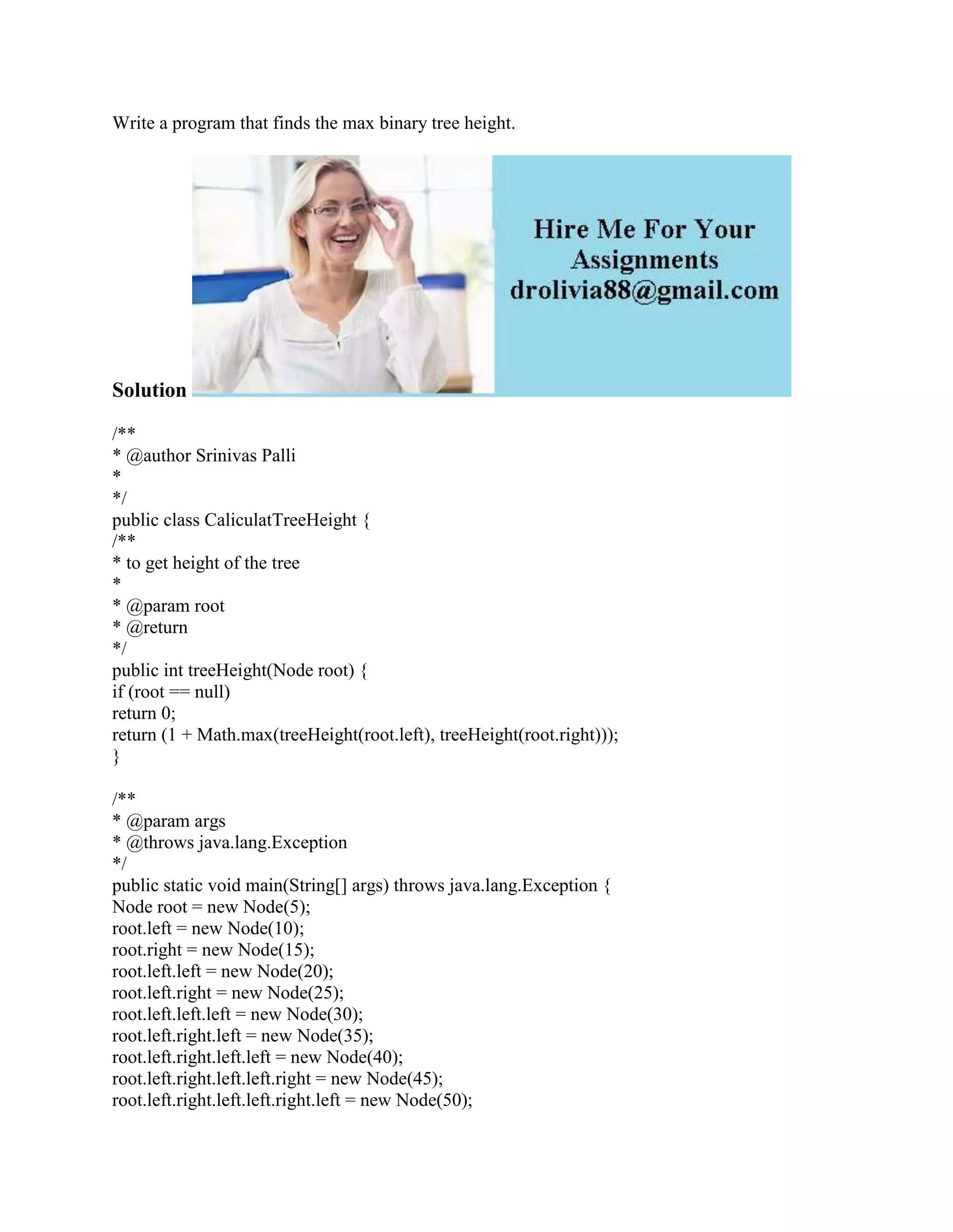 Write a program that finds the max binary tree height. Solution /** * @author Srinivas Palli * */ public class CaliculatTreeHeight { /** * to get height of the tree * * @param root * @return */ public int treeHeight(Node root) { if (root == null) return 0; return (1 + Math.max(treeHeight(root.left), treeHeight(root.right))); } /** * @param args * @throws java.lang.Exception */ public static void main(String[] args) throws java.lang.Exception { Node root = new Node(5); root.left = new Node(10); root.right = new Node(15); root.left.left = new Node(20); root.left.right = new Node(25); root.left.left.left = new Node(30); root.left.right.left = new Node(35); root.left.right.left.left = new Node(40); root.left.right.left.left.right = new Node(45); root.left.right.left.left.right.left = new Node(50); CaliculatTreeHeight caliculatTreeHeight = new CaliculatTreeHeight(); System.out.println(\"Height of the Tree is :\" + caliculatTreeHeight.treeHeight(root)); } } /** * @author Srinivas Palli * */ class Node { int data; Node left; Node right; /** * @param data */ public Node(int data) { this.data = data; this.left = null; this.right = null; } } OUTPUT: Height of the Tree is :7 .