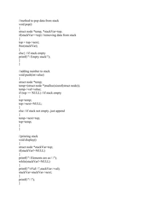 The document provides a C program for implementing a stack using a linked list in a Unix environment. It includes structure definitions for nodes and stacks, along with functions for initializing the stack, pushing and popping integers, and displaying stack contents. The main function offers a simple menu interface for user interaction with the stack operations.