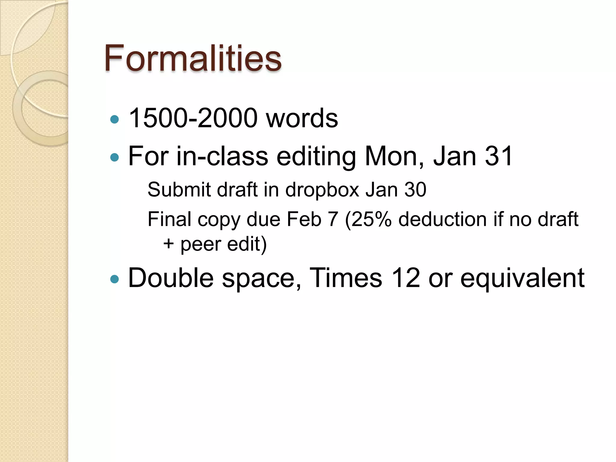 This document provides instructions for writing about a place in 1500-2000 words for an assignment due February 7th. It asks students to submit a draft by January 30th for peer editing and says the final copy will be deducted 25% if no draft is submitted. It also lists what the instructor is looking for, including a tight focus on a place, detailed evocation of place and time, and a central idea or metaphor with a universal theme. It gives tips on how to achieve this, such as showing not telling, using a controlling metaphor, engaging all five senses and observation, and filling the descriptive frame.