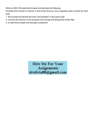 The document requests the creation of AES 128 encryption and decryption code for Arduino C. It specifies three cases: encoding and decoding the word 'conversation', connecting Arduino to a computer for file encryption and decryption, and handling password encryption and decryption. The request emphasizes error-free implementation for each scenario.