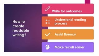 This document provides guidance on writing for readability and neurocognitive ease. It discusses three key stages of the reading process - lexical, syntactic, and inference building. To aid comprehension, assimilation and recall, writers should use familiar words, clear subject-verb-object sentence structures, chronological order, and continuity between ideas. Focusing on speed, efficiency and accuracy of recall, the document recommends techniques like priming content, hierarchy of information, and placing positives before negatives. The overall goal is to make written content feel easy to understand and mentally effortless for readers.