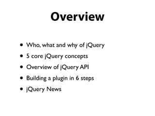 The document provides an overview of jQuery, a JavaScript library that simplifies web development by handling tasks such as DOM manipulation, events, animations, and AJAX interactions. It outlines key concepts such as jQuery parameter types, chaining, and implicit iteration, as well as practical examples and the advantages of using jQuery. Additionally, it highlights its widespread adoption across notable websites and the support available for developers through various resources.