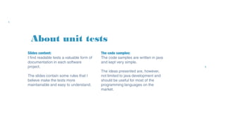 The document provides guidance on writing readable and maintainable unit tests in Java, emphasizing the importance of clarity and focus in test naming and structure. Key principles include: keeping tests context unaware by mocking collaborators, creating relevant test data instead of relying on mocks, and adopting a declarative style in test descriptions. The author, Marian Wamsiedel, suggests practical approaches to testing that are applicable across various programming languages.