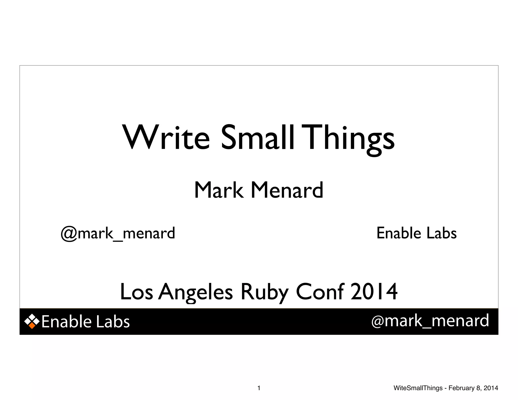 The document discusses the importance of writing small and maintainable code, advocating for small methods and classes, and the challenges that come with dependency and context management. It emphasizes the use of refactoring techniques such as extracting methods and classes, and outlines best practices for writing clear and effective code. The author, Mark Menard, also provides practical examples related to command line options in Ruby programming.