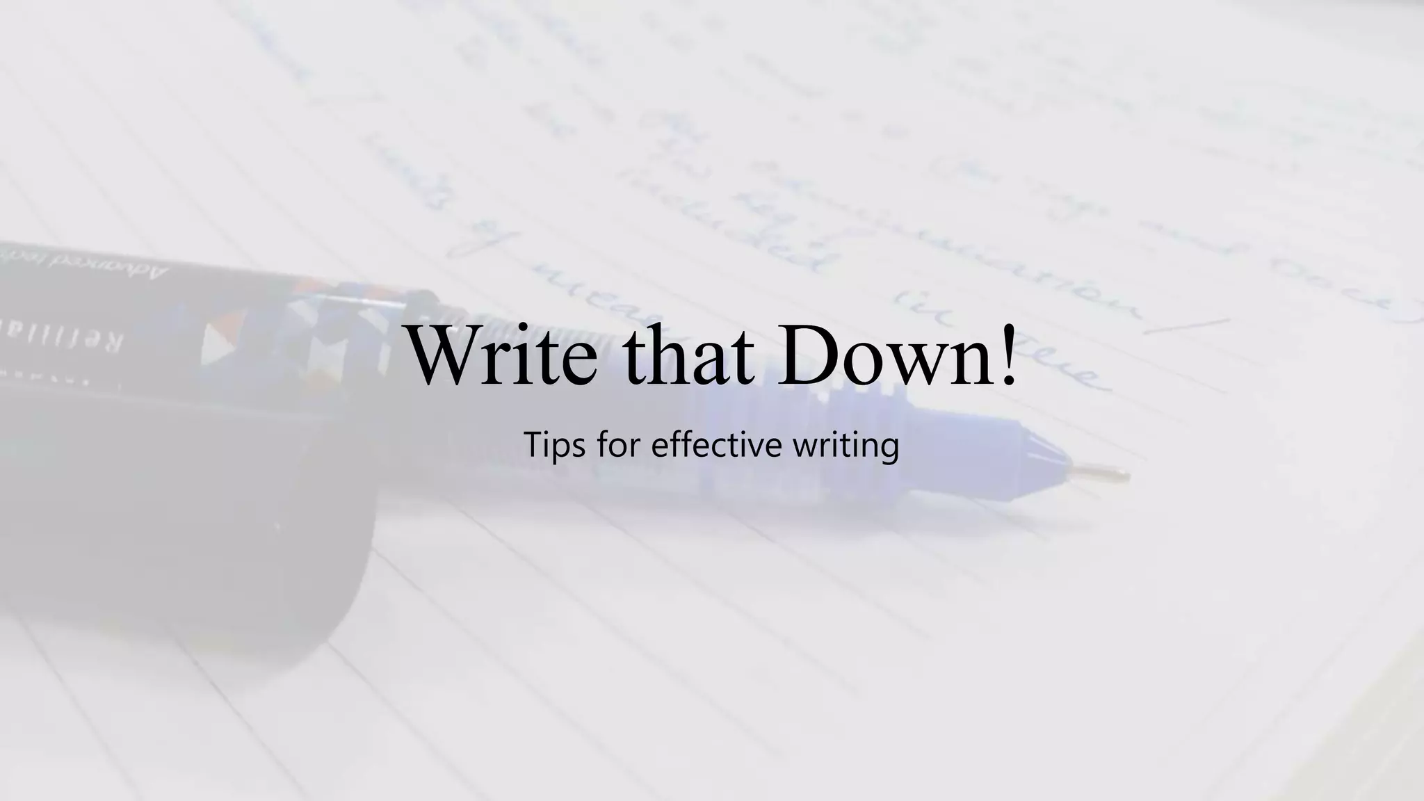 The document provides tips for effective writing. It discusses designing writing like a script and following the design. It also discusses interpreting information objectively and subjectively. Learning is presented as a by-product where readers learn more when they don't realize they are learning. The tips encourage rewriting to improve writing and editing with attention to details and meanings across sentences.