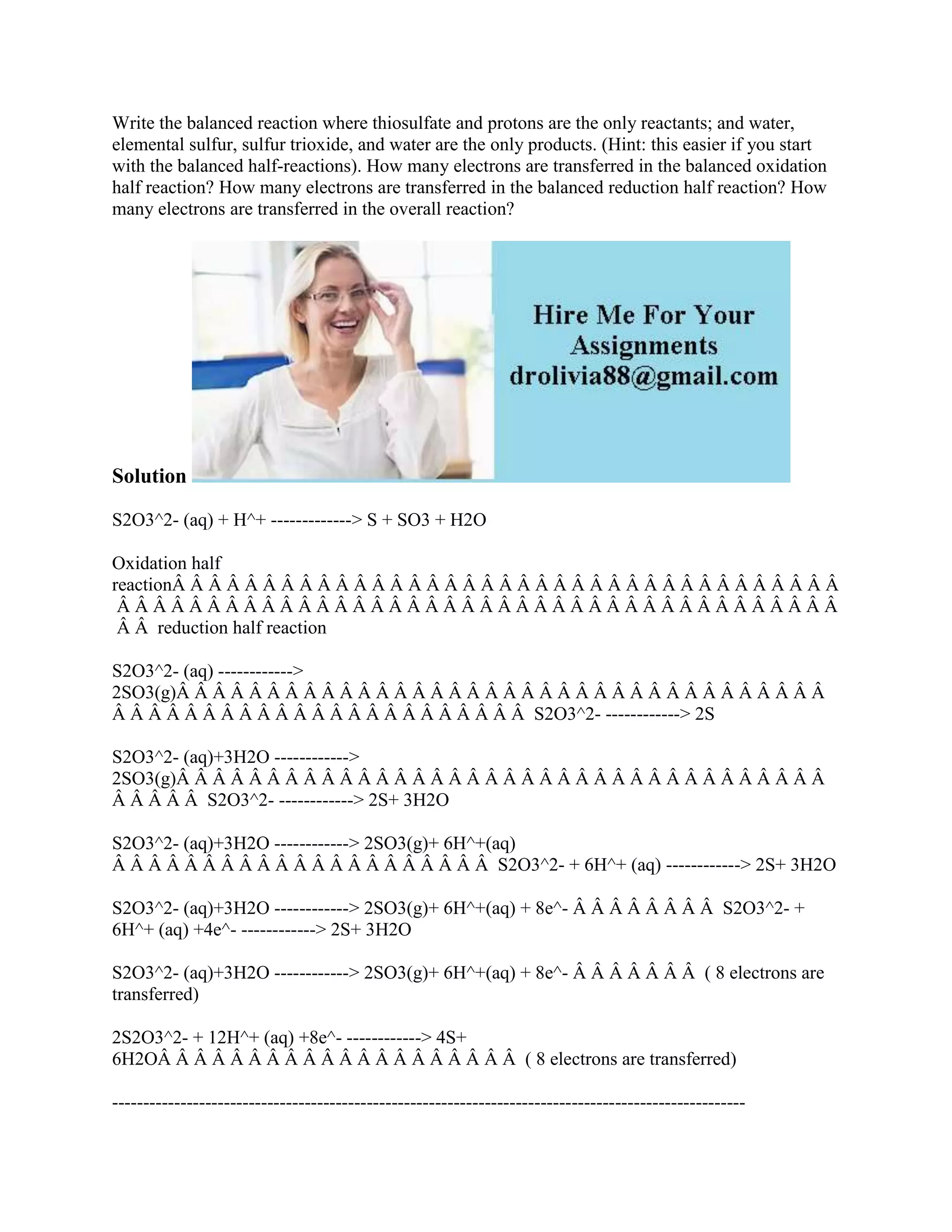The document outlines the balanced chemical reactions involving thiosulfate and protons, resulting in the formation of elemental sulfur, sulfur trioxide, and water. It details the oxidation and reduction half-reactions, indicating that 8 electrons are transferred in both the balanced oxidation and reduction half-reactions, as well as in the overall reaction. The final balanced reaction combines these components into a single equation.