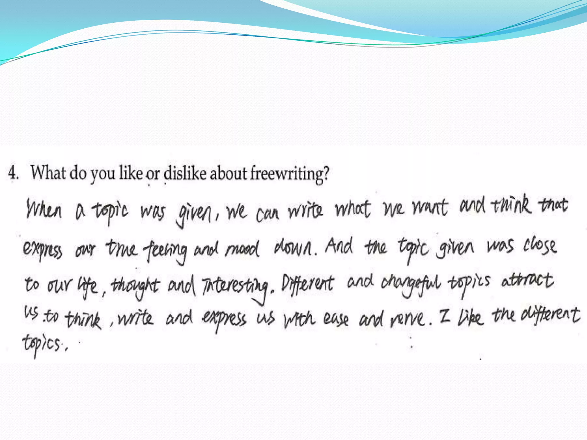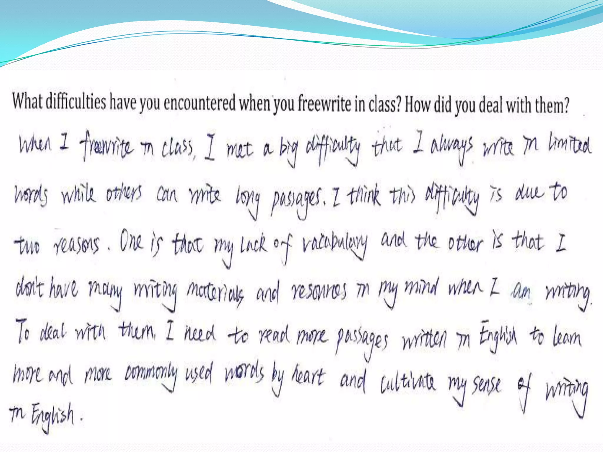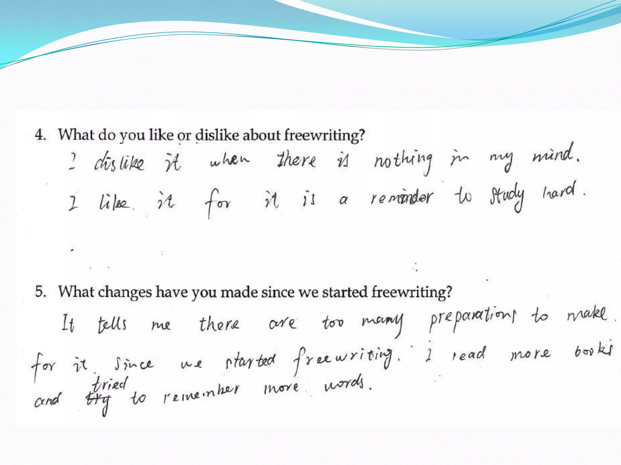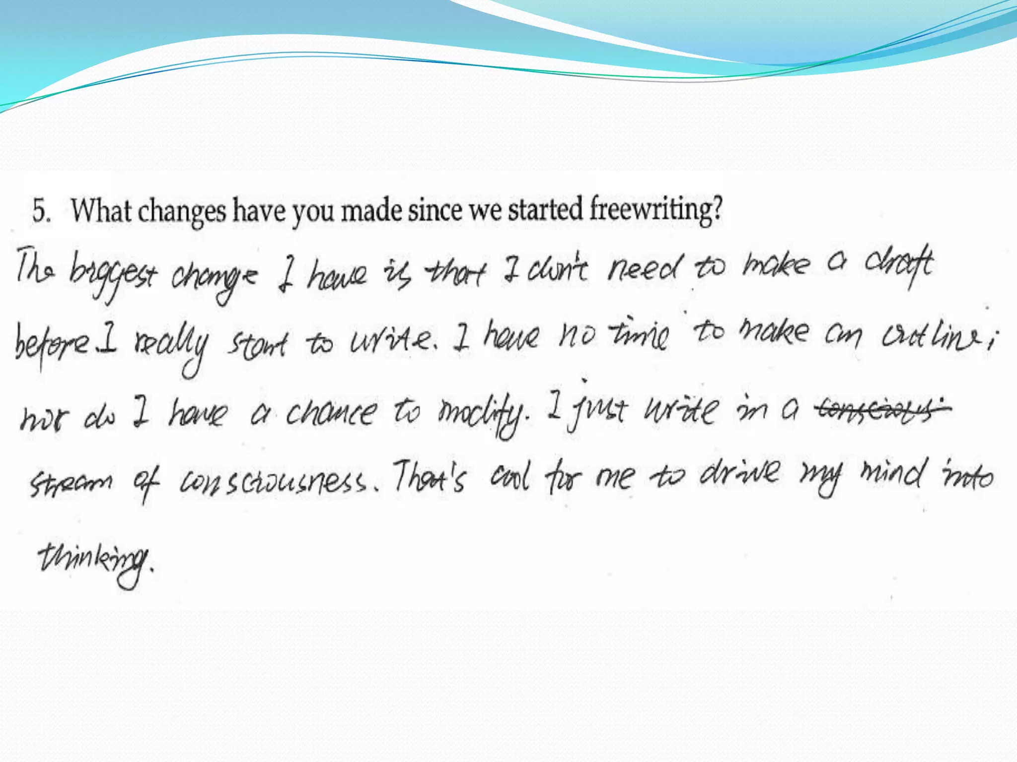 This document summarizes a study on using freewriting in an English language learner (ELL) classroom. The study examined what happens when ELL students engage in freewriting activities in their English class. Data was collected through student writing samples, observations, interviews, surveys, and field notes. Analysis found that freewriting helped students learn writing, learn through writing, and become more independent learners. Specifically, freewriting improved students' writing development, allowed them to review lessons, identify strengths and weaknesses, and reflect metacognitively. The implications are that freewriting can be an effective practice to include in ELL curricula as it increases reflective thinking and supports the development of