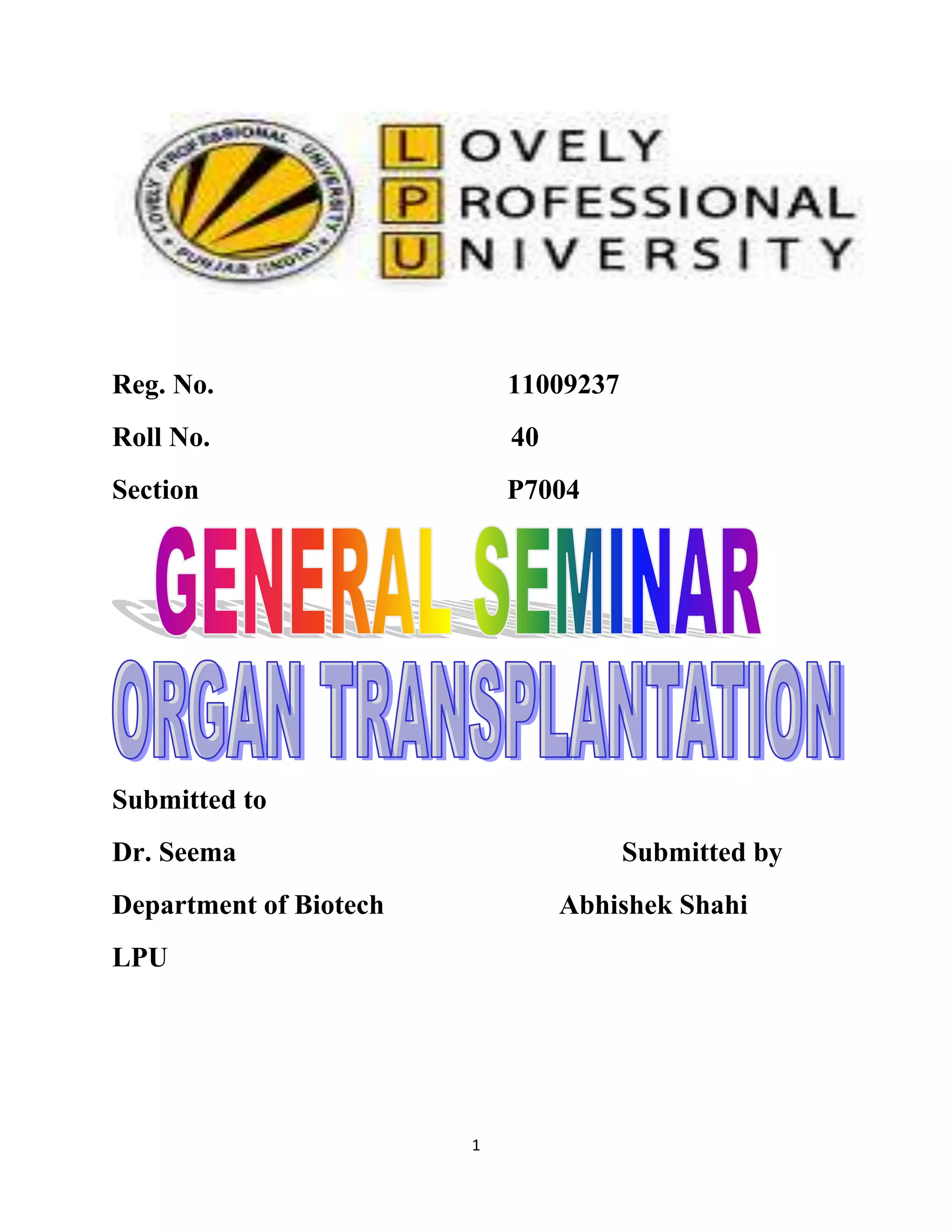 The document provides an overview of organ transplantation including a brief history, the transplant process, sources of donor organs, and issues around organ distribution and shortages. It discusses how transplantable organs are matched with recipients, current policies for distributing scarce organs, and ethical questions around living vs. cadaveric donation. Legal and social issues related to transplantation are also mentioned.