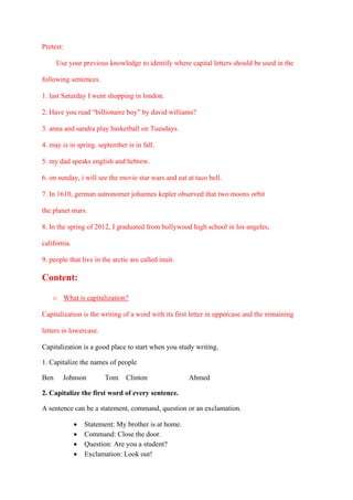 The document provides a comprehensive lesson on the rules of capitalization in English writing. It outlines learning objectives, prerequisites, and includes exercises to reinforce the importance of correct capitalization for clarity in communication. Capitalization is essential for signaling sentence beginnings, highlighting important words, and representing proper names, contributing to more effective written communication.