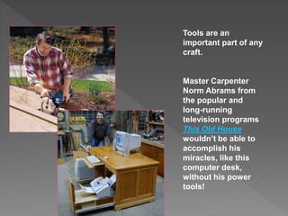 The document discusses the importance of having the proper tools for any craft or profession. It focuses on writing tools and summarizes Stephen King's perspective that writers need to build their own toolbox with the necessary vocabulary, grammar skills, and writing techniques to succeed. King believes writers must gain a deep understanding of these tools and how to use them effectively to communicate their ideas to readers. The document provides examples of tools that should be included in a writer's toolbox and strategies for gaining knowledge and practicing the craft of writing.