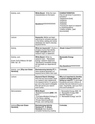 The instructor provided a library instruction session covering key concepts for researching topics, including: